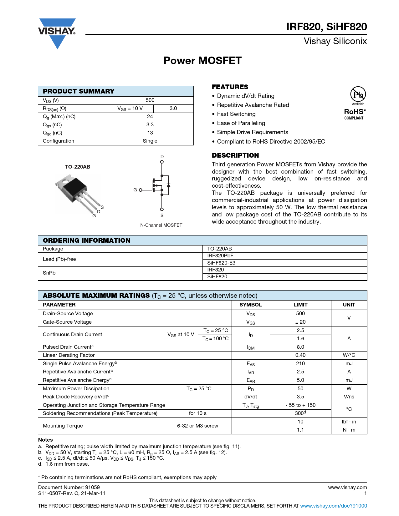 IRF820, SiHF820 Vishay Siliconix Power MOSFETFEATURESPRODUCT SUMMARY • Dynamic dV/dt Rating VDS (V) 500 • Repetitive Avalanche Rated Available RDS(on) () VGS = 10 V 3.0 • Fast Switching RoHS* Qg (Max.) (nC) 24 COMPLIANT • Ease of Paralleling Qgs (nC) 3.3 Q • Simple Drive Requirements gd (nC) 13 Configuration Single • Compliant to RoHS Directive 2002/95/EC D DESCRIPTION Third generation Power MOSFETs from Vishay provide the TO-220AB designer with the best combination of fast switching, ruggedized device design, low on-resistance and cost-effectiveness. G The TO-220AB package is universally preferred for commercial-industrial applications at power dissipation S levels to approximately 50 W. The low thermal resistance D G S and low package cost of the TO-220AB contribute to its wide acceptance throughout the industry. N-Channel MOSFET ORDERING INFORMATION Package TO-220AB IRF820PbF Lead (Pb)-free SiHF820-E3 IRF820 SnPb SiHF820 ABSOLUTE MAXIMUM RATINGS (TC = 25 °C, unless otherwise noted) PARAMETER SYMBOLLIMITUNIT Drain-Source Voltage VDS 500 V Gate-Source Voltage VGS ± 20 TC = 25 °C 2.5 Continuous Drain Current VGS at 10 V ID TC = 100 °C 1.6 A Pulsed Drain Currenta IDM 8.0 Linear Derating Factor 0.40 W/°C Single Pulse Avalanche Energyb EAS 210 mJ Repetitive Avalanche Currenta IAR 2.5 A Repetitive Avalanche Energya EAR 5.0 mJ Maximum Power Dissipation TC = 25 °C PD 50 W Peak Diode Recovery dV/dtc dV/dt 3.5 V/ns Operating Junction and Storage Temperature Range TJ, Tstg - 55 to + 150 °C Soldering Recommendations (Peak Temperature) for 10 s 300d 10 lbf · in Mounting Torque 6-32 or M3 screw 1.1 N · m Notes a. Repetitive rating; pulse width limited by maximum junction temperature (see fig. 11). b. VDD = 50 V, starting TJ = 25 °C, L = 60 mH, Rg = 25 , IAS = 2.5 A (see fig. 12). c. ISD 2.5 A, dI/dt 50 A/μs, VDD VDS, TJ 150 °C. d. 1.6 mm from case. * Pb containing terminations are not RoHS compliant, exemptions may apply Document Number: 91059 www.vishay.com S11-0507-Rev. C, 21-Mar-11 1 This datasheet is subject to change without notice. THE PRODUCT DESCRIBED HEREIN AND THIS DATASHEET ARE SUBJECT TO SPECIFIC DISCLAIMERS, SET FORTH AT www.vishay.com/doc?91000