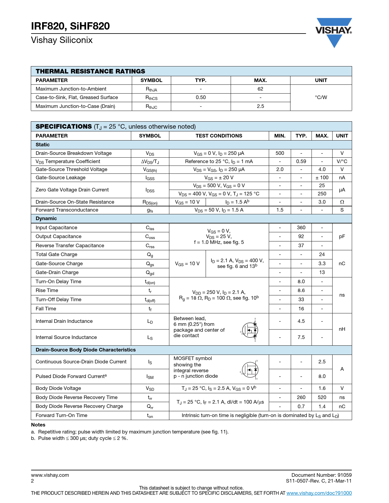 IRF820, SiHF820 Vishay Siliconix THERMAL RESISTANCE RATINGSPARAMETER SYMBOLTYP.MAX.UNIT Maximum Junction-to-Ambient RthJA - 62 Case-to-Sink, Flat, Greased Surface RthCS 0.50 - °C/W Maximum Junction-to-Case (Drain) RthJC - 2.5 SPECIFICATIONS (TJ = 25 °C, unless otherwise noted) PARAMETER SYMBOLTESTCONDITIONS MIN.TYP.MAX.UNITStatic Drain-Source Breakdown Voltage VDS VGS = 0 V, ID = 250 μA 500 - - V VDS Temperature Coefficient VDS/TJ Reference to 25 °C, ID = 1 mA - 0.59 - V/°C Gate-Source Threshold Voltage VGS(th) VDS = VGS, ID = 250 μA 2.0 - 4.0 V Gate-Source Leakage IGSS VGS = ± 20 V - - ± 100 nA VDS = 500 V, VGS = 0 V - - 25 Zero Gate Voltage Drain Current IDSS μA VDS = 400 V, VGS = 0 V, TJ = 125 °C - - 250 Drain-Source On-State Resistance RDS(on) VGS = 10 V ID = 1.5 Ab - - 3.0 Forward Transconductance gfs VDS = 50 V, ID = 1.5 A 1.5 - - S Dynamic Input Capacitance Ciss - 360 - VGS = 0 V, Output Capacitance Coss VDS = 25 V, - 92 - pF f = 1.0 MHz, see fig. 5 Reverse Transfer Capacitance Crss - 37 - Total Gate Charge Qg - - 24 I Gate-Source Charge Qgs V D = 2.1 A, VDS = 400 V, GS = 10 V - - 3.3 nC see fig. 6 and 13b Gate-Drain Charge Qgd - - 13 Turn-On Delay Time td(on) - 8.0 - Rise Time tr V - 8.6 - DD = 250 V, ID = 2.1 A, ns Rg = 18 , RD = 100 , see fig. 10b Turn-Off Delay Time td(off) - 33 - Fall Time tf - 16 - Between lead, D Internal Drain Inductance LD - 4.5 - 6 mm (0.25") from package and center of nH G die contact Internal Source Inductance LS - 7.5 - S Drain-Source Body Diode Characteristics MOSFET symbol Continuous Source-Drain Diode Current I D S - - 2.5 showing the integral reverse A G Pulsed Diode Forward Currenta I p - n junction diode SM - - 8.0 S Body Diode Voltage VSD TJ = 25 °C, IS = 2.5 A, VGS = 0 Vb - - 1.6 V Body Diode Reverse Recovery Time trr - 260 520 ns TJ = 25 °C, IF = 2.1 A, dI/dt = 100 A/s Body Diode Reverse Recovery Charge Qrr - 0.7 1.4 nC Forward Turn-On Time ton Intrinsic turn-on time is negligible (turn-on is dominated by LS and LD) Notes a. Repetitive rating; pulse width limited by maximum junction temperature (see fig. 11). b. Pulse width 300 μs; duty cycle 2 %. www.vishay.com Document Number: 91059 2 S11-0507-Rev. C, 21-Mar-11 This datasheet is subject to change without notice. THE PRODUCT DESCRIBED HEREIN AND THIS DATASHEET ARE SUBJECT TO SPECIFIC DISCLAIMERS, SET FORTH AT www.vishay.com/doc?91000