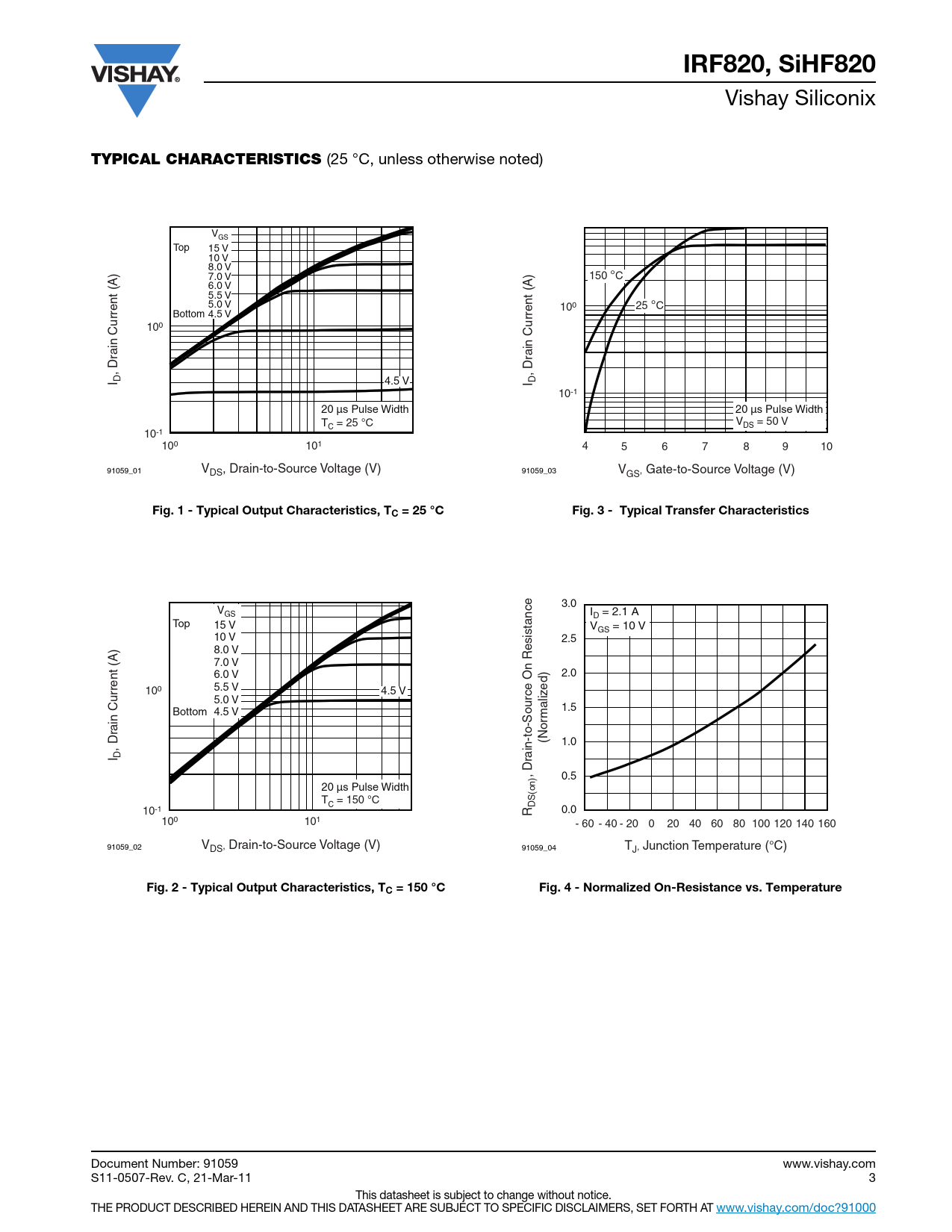 IRF820, SiHF820 Vishay Siliconix TYPICAL CHARACTERISTICS (25 °C, unless otherwise noted) VGS Top 15 V 10 V 8.0 V 7.0 V 150 °C 6.0 V 5.5 V 5.0 V 100 25 °C Bottom 4.5 V 100 ain Current (A) ain Current (A) , Dr , Dr I D 4.5 V I D 10-1 20 µs Pulse Width 20 µs Pulse Width T = 25 °C V = 50 V C DS 10-1 100 101 4 5 6 7 8 9 10 91059_01 VDS, Drain-to-Source Voltage (V) 91059_03 VGS, Gate-to-Source Voltage (V) Fig. 1 - Typical Output Characteristics, TC = 25 °CFig. 3 - Typical Transfer Characteristics 3.0 VGS I = 2.1 A D Top 15 V V = 10 V GS 10 V 2.5 8.0 V 7.0 V 6.0 V 2.0 ed) 100 5.5 V 4.5 V 5.0 V 1.5 Bottom 4.5 V maliz ain Current (A) (Nor , Dr 1.0 I D ain-to-Source On Resistance , Dr 0.5 20 µs Pulse Width T = 150 °C C DS(on) 10-1 0.0 R 100 101 - 60 - 40 - 20 0 20 40 60 80 100 120 140 160 91059_02 VDS, Drain-to-Source Voltage (V) 91059_04 TJ, Junction Temperature (°C) Fig. 2 - Typical Output Characteristics, TC = 150 °CFig. 4 - Normalized On-Resistance vs. Temperature Document Number: 91059 www.vishay.com S11-0507-Rev. C, 21-Mar-11 3 This datasheet is subject to change without notice. THE PRODUCT DESCRIBED HEREIN AND THIS DATASHEET ARE SUBJECT TO SPECIFIC DISCLAIMERS, SET FORTH AT www.vishay.com/doc?91000