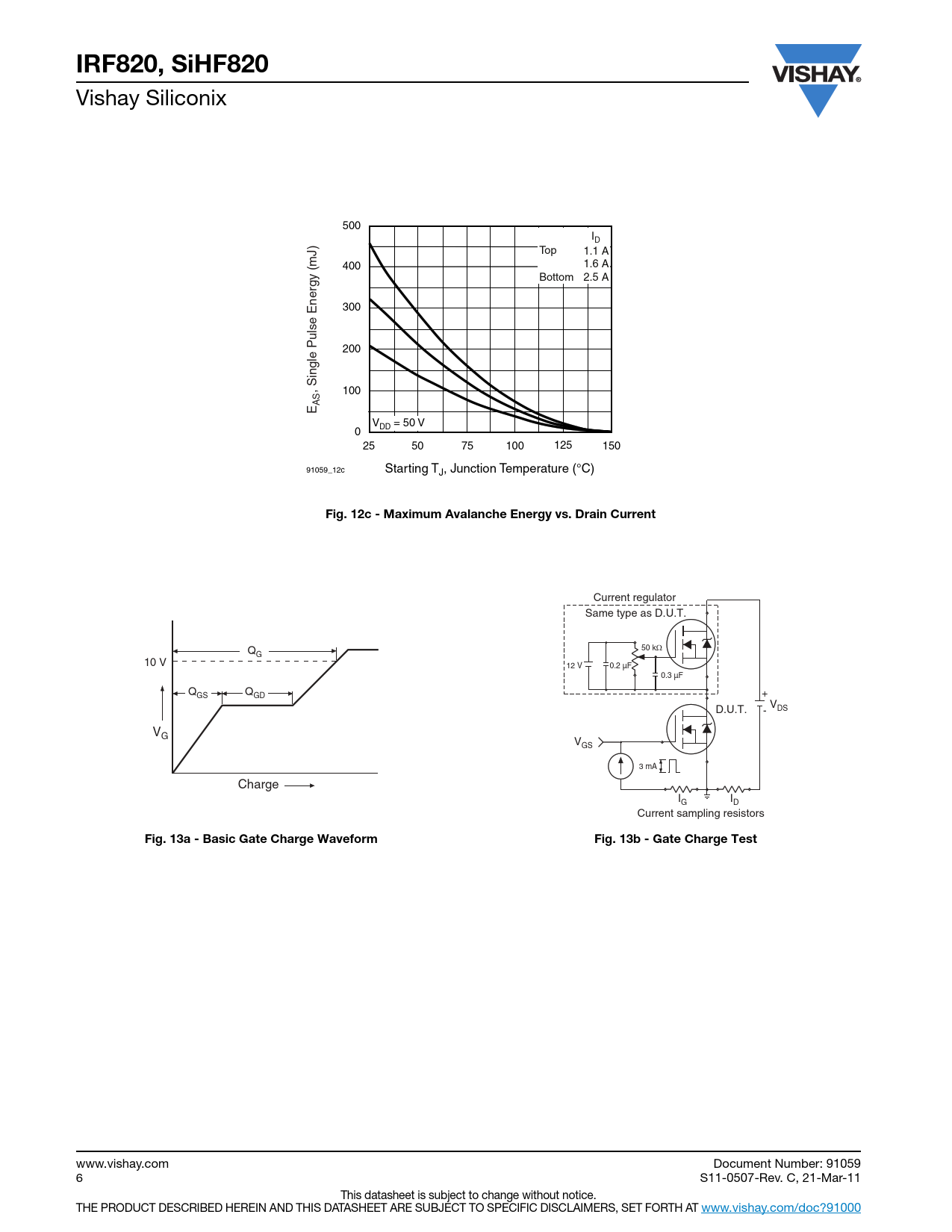 IRF820, SiHF820 Vishay Siliconix 500 ID Top 1.1 A 400 1.6 A Bottom 2.5 A 300 200 , Single Pulse Energy (mJ) 100 ASE V = 50 V DD 0 25 50 75 100 125 150 91059_12c Starting TJ, Junction Temperature (°C) Fig. 12c - Maximum Avalanche Energy vs. Drain Current Current regulator Same type as D.U.T. Q 50 kΩ G 10 V 12 V 0.2 µF 0.3 µF Q Q GS GD + V D.U.T. DS - VG VGS 3 mA Charge I I G D Current sampling resistors Fig. 13a - Basic Gate Charge WaveformFig. 13b - Gate Charge Test www.vishay.com Document Number: 91059 6 S11-0507-Rev. C, 21-Mar-11 This datasheet is subject to change without notice. THE PRODUCT DESCRIBED HEREIN AND THIS DATASHEET ARE SUBJECT TO SPECIFIC DISCLAIMERS, SET FORTH AT www.vishay.com/doc?91000