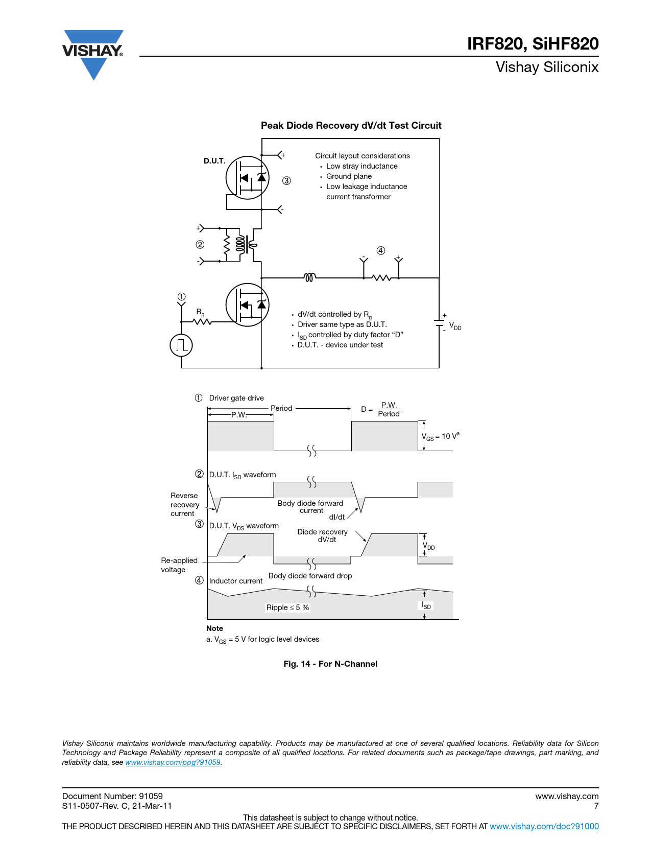 IRF820, SiHF820. Peak Diode Recovery dV/dt Test Circuit. D.U.T. Note. Fig. 14 - For N-Channel
