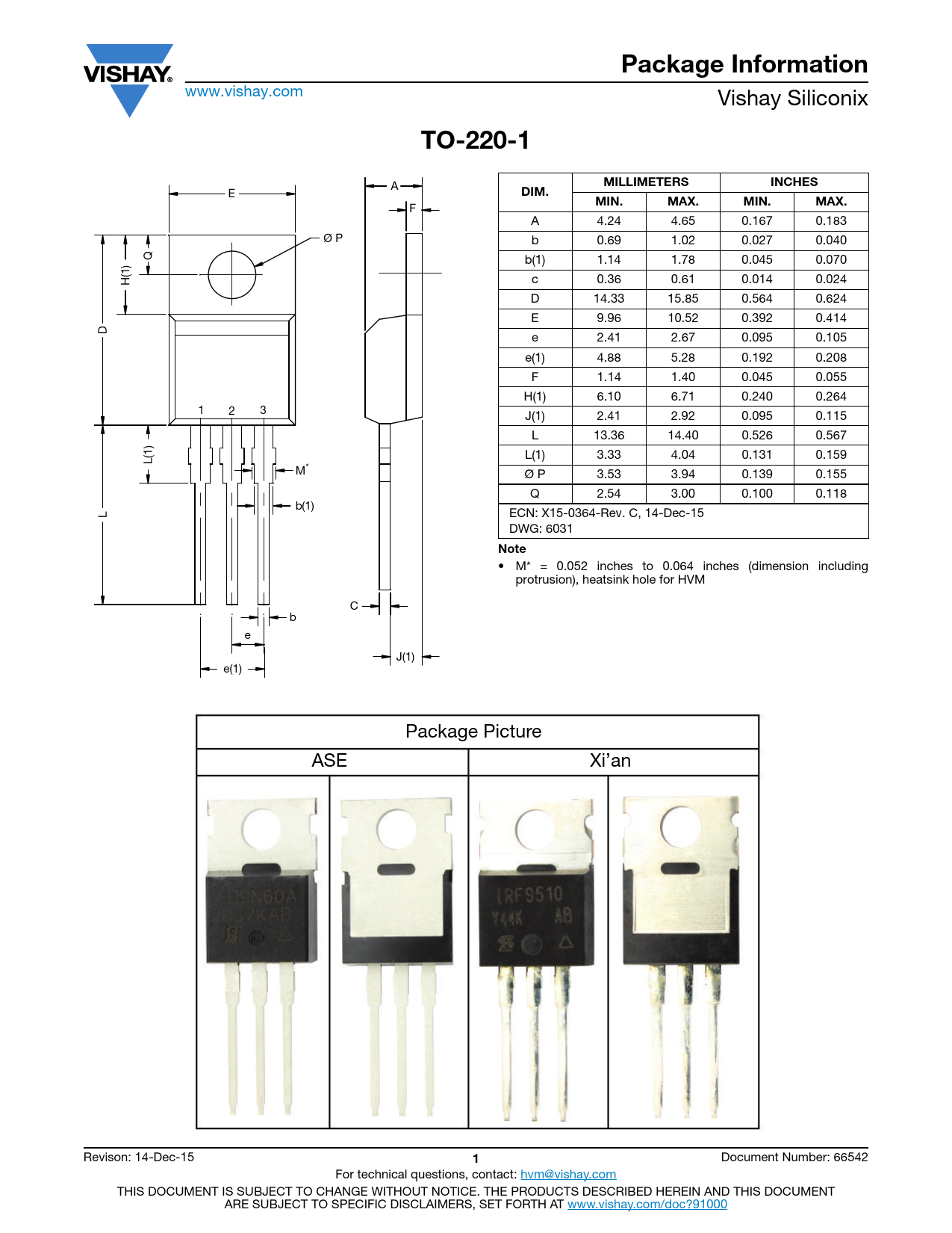 F A 4.24 4.65 0.167 0.183 Ø P b 0.69 1.02 0.027 0.040 Q b(1) 1.14 1.78 0.045 0.070 H(1) c 0.36 0.61 0.014 0.024 D 14.33 15.85 0.564 0.624 E 9.96 10.52 0.392 0.414 D e 2.41 2.67 0.095 0.105 e(1) 4.88 5.28 0.192 0.208 F 1.14 1.40 0.045 0.055 H(1) 6.10 6.71 0.240 0.264 1 2 3 J(1) 2.41 2.92 0.095 0.115 L 13.36 14.40 0.526 0.567 L(1) 3.33 4.04 0.131 0.159 L(1) M* Ø P 3.53 3.94 0.139 0.155 Q 2.54 3.00 0.100 0.118 b(1) L ECN: X15-0364-Rev. C, 14-Dec-15 DWG: 6031
