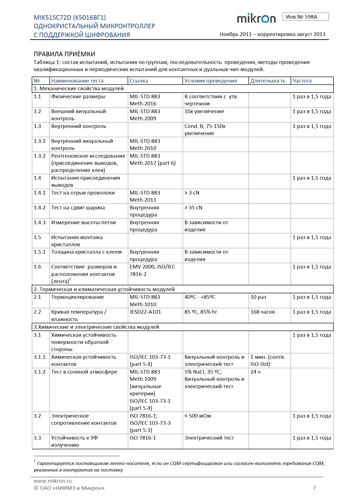 MIK51SC72D. (K5016ВГ1). Инв.№. 598А. ОДНОКРИСТАЛЬНЫЙ. МИКРОНТРОЛЛЕР. С. ПОДДЕРЖКОЙ. ШИФРОВАНИЯ. Ноябрь. 2011. –. корректировка. август. 2013. ПРАВИЛА