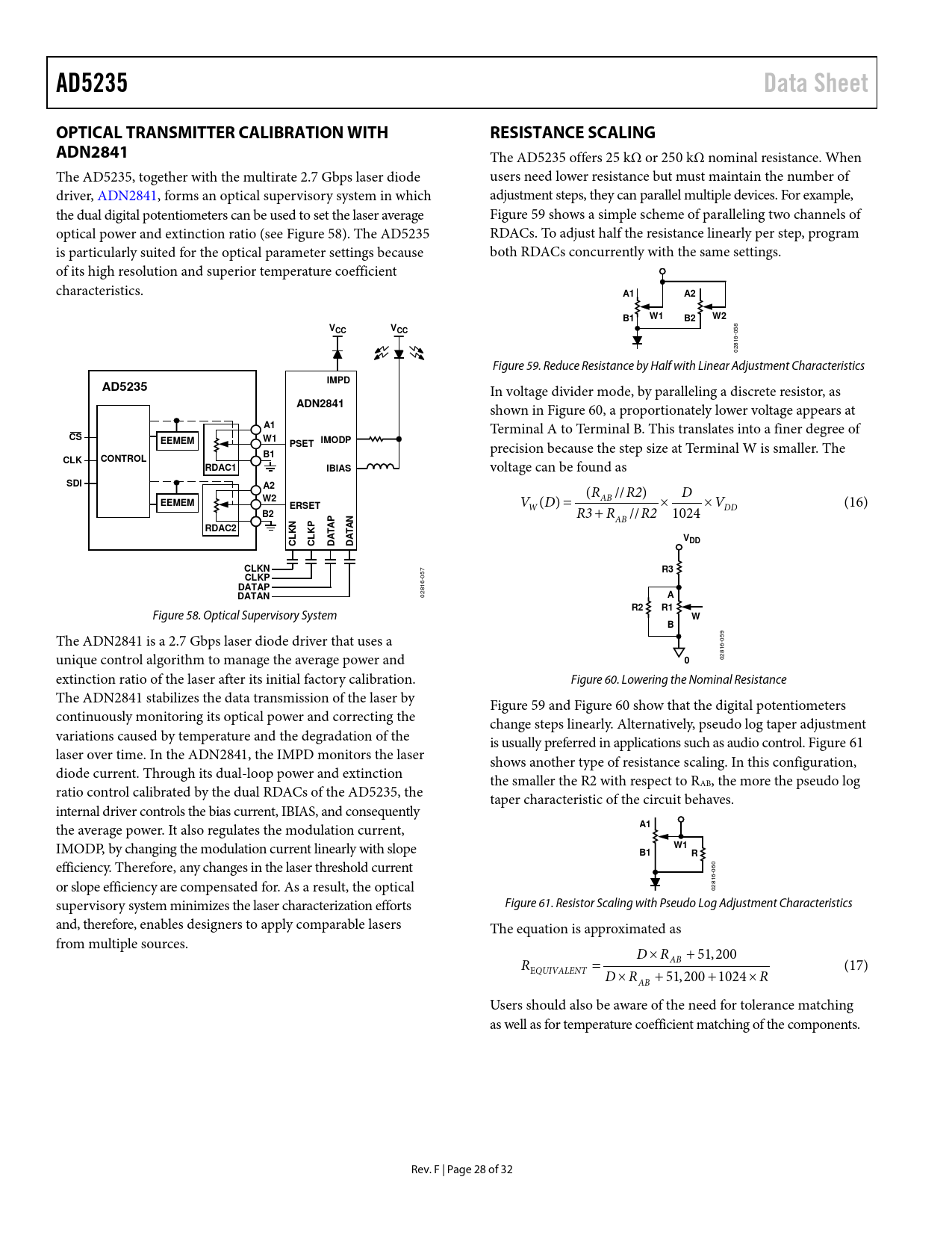 link to page 28 link to page 28 link to page 28 link to page 28 link to page 28 link to page 28 AD5235Data SheetOPTICAL TRANSMITTER CALIBRATION WITHRESISTANCE SCALINGADN2841 The AD5235 offers 25 kΩ or 250 kΩ nominal resistance. When The AD5235, together with the multirate 2.7 Gbps laser diode users need lower resistance but must maintain the number of driver, ADN2841, forms an optical supervisory system in which adjustment steps, they can parallel multiple devices. For example, the dual digital potentiometers can be used to set the laser average Figure 59 shows a simple scheme of paralleling two channels of optical power and extinction ratio (see Figure 58). The AD5235 RDACs. To adjust half the resistance linearly per step, program is particularly suited for the optical parameter settings because both RDACs concurrently with the same settings. of its high resolution and superior temperature coefficient characteristics. A1A2B1W1W2B2VCCVCC 058 02816- Figure 59. Reduce Resistance by Half with Linear Adjustment Characteristics IMPDAD5235 In voltage divider mode, by paralleling a discrete resistor, as ADN2841 shown in Figure 60, a proportionately lower voltage appears at A1 Terminal A to Terminal B. This translates into a finer degree of CSW1EEMEMPSET IMODP precision because the step size at Terminal W is smaller. The B1CLKCONTROLRDAC1IBIAS voltage can be found as SDIA2 (R //R2) D W2 AB EEMEM ( ) = × × ERSET W V D DD V (16) B2 R3 + R //R2 1024 P AB PAANRDAC2KNKATATVCLCLDDDDCLKNR3 057 CLKPDATAP 02816- DATANAR2R1 Figure 58. Optical Supervisory System WB The ADN2841 is a 2.7 Gbps laser diode driver that uses a 059 unique control algorithm to manage the average power and 0 02816- extinction ratio of the laser after its initial factory calibration. Figure 60. Lowering the Nominal Resistance The ADN2841 stabilizes the data transmission of the laser by Figure 59 and Figure 60 show that the digital potentiometers continuously monitoring its optical power and correcting the change steps linearly. Alternatively, pseudo log taper adjustment variations caused by temperature and the degradation of the is usual y preferred in applications such as audio control. Figure 61 laser over time. In the ADN2841, the IMPD monitors the laser shows another type of resistance scaling. In this configuration, diode current. Through its dual-loop power and extinction the smal er the R2 with respect to R ratio control calibrated by the dual RDACs of the AD5235, the AB, the more the pseudo log taper characteristic of the circuit behaves. internal driver controls the bias current, IBIAS, and consequently the average power. It also regulates the modulation current, A1 IMODP, by changing the modulation current linearly with slope W1B1R efficiency. Therefore, any changes in the laser threshold current 060 or slope efficiency are compensated for. As a result, the optical 02816- supervisory system minimizes the laser characterization efforts Figure 61. Resistor Scaling with Pseudo Log Adjustment Characteristics and, therefore, enables designers to apply comparable lasers The equation is approximated as from multiple sources. D × R + , 51 200 R AB = Q E UIVALENT (17) D × R + , 51 200 +1024 × AB R Users should also be aware of the need for tolerance matching as wel as for temperature coefficient matching of the components. Rev. F | Page 28 of 32 Document Outline Features Applications General Description Functional Block Diagram Revision History Specifications Electrical Characteristics—25 kΩ, 250 kΩ Versions Interface Timing and EEMEM Reliability Characteristics—25 kΩ, 250 kΩ Versions Timing Diagrams Absolute Maximum Ratings ESD Caution Pin Configuration and Function Descriptions Typical Performance Characteristics Test Circuits Theory of Operation Scratchpad and EEMEM Programming Basic Operation EEMEM Protection Digital Input and Output Configuration Serial Data Interface Daisy-Chain Operation Terminal Voltage Operating Range Power-Up Sequence Layout and Power Supply Bypassing Advanced Control Modes Linear Increment and Decrement Instructions Logarithmic Taper Mode Adjustment Using to Re-Execute a Previous Command Using Additional Internal Nonvolatile EEMEM Calculating Actual End-to-End Terminal Resistance RDAC Structure Programming the Variable Resistor Rheostat Operation Programming the Potentiometer Divider Voltage Output Operation Programming Examples EVAL-AD5235SDZ Evaluation Kit Applications Information Bipolar Operation from Dual Supplies Gain Control Compensation High Voltage Operation DAC Bipolar Programmable Gain Amplifier 10-Bit Bipolar DAC Programmable Voltage Source with Boosted Output Programmable Current Source Programmable Bidirectional Current Source Programmable Low-Pass Filter Programmable Oscillator Optical Transmitter Calibration with ADN2841 Resistance Scaling Resistance Tolerance, Drift, and Temperature Coefficient Mismatch Considerations RDAC Circuit Simulation Model Outline Dimensions Ordering Guide
