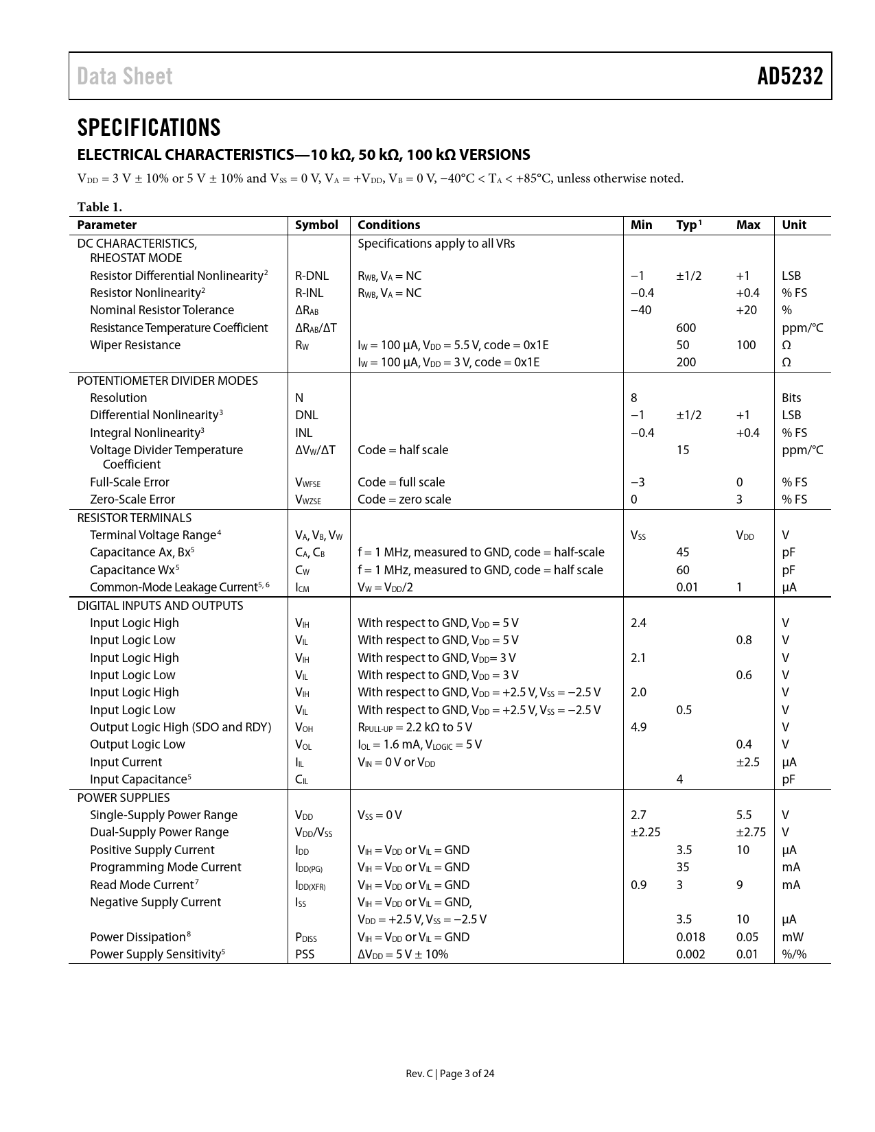 Data Sheet. AD5232. SPECIFICATIONS ELECTRICAL CHARACTERISTICS—10 kΩ, 50 kΩ, 100 kΩ VERSIONS. Table 1. Parameter. Symbol