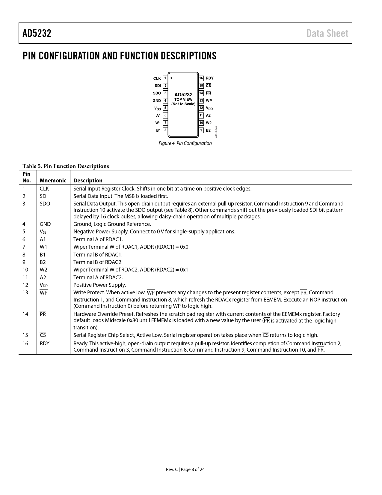 link to page 16 AD5232Data SheetPIN CONFIGURATION AND FUNCTION DESCRIPTIONSCLK 116RDYSDI215CSSDO314PRAD5232GND4TOP VIEW13WP(Not to Scale)V5SS12VDDA1611A2W1710W2B189B2 004 02618- Figure 4. Pin Configuration Table 5. Pin Function Descriptions Pin No.Mnemonic Description 1 CLK Serial Input Register Clock. Shifts in one bit at a time on positive clock edges. 2 SDI Serial Data Input. The MSB is loaded first. 3 SDO Serial Data Output. This open-drain output requires an external pull-up resistor. Command Instruction 9 and Command Instruction 10 activate the SDO output (see Table 8). Other commands shift out the previously loaded SDI bit pattern delayed by 16 clock pulses, allowing daisy-chain operation of multiple packages. 4 GND Ground, Logic Ground Reference. 5 VSS Negative Power Supply. Connect to 0 V for single-supply applications. 6 A1 Terminal A of RDAC1. 7 W1 Wiper Terminal W of RDAC1, ADDR (RDAC1) = 0x0. 8 B1 Terminal B of RDAC1. 9 B2 Terminal B of RDAC2. 10 W2 Wiper Terminal W of RDAC2, ADDR (RDAC2) = 0x1. 11 A2 Terminal A of RDAC2. 12 VDD Positive Power Supply. 13 WP Write Protect. When active low, WP prevents any changes to the present register contents, except PR, Command Instruction 1, and Command Instruction 8, which refresh the RDACx register from EEMEM. Execute an NOP instruction (Command Instruction 0) before returning WP to logic high. 14 PR Hardware Override Preset. Refreshes the scratch pad register with current contents of the EEMEMx register. Factory default loads Midscale 0x80 until EEMEMx is loaded with a new value by the user (PR is activated at the logic high transition). 15 CS Serial Register Chip Select, Active Low. Serial register operation takes place when CS returns to logic high. 16 RDY Ready. This active-high, open-drain output requires a pull-up resistor. Identifies completion of Command Instruction 2, Command Instruction 3, Command Instruction 8, Command Instruction 9, Command Instruction 10, and PR. Rev. C | Page 8 of 24 Document Outline Features Applications Functional Block Diagram General Description Revision History Specifications Electrical Characteristics—10 kΩ, 50 kΩ, 100 kΩ Versions Interface Timing Characteristics Timing Diagrams Absolute Maximum Ratings Thermal Resistance ESD Caution Pin Configuration and Function Descriptions Typical Performance Characteristics Test Circuits Theory of Operation Scratch Pad and EEMEM Programming Basic Operation EEMEM Protection Digital Input/Output Configuration Serial Data Interface Daisy-Chaining Operation Advanced Control Modes Increment and Decrement Commands Logarithmic Taper Mode Adjustment Using Additional Internal, Nonvolatile EEMEM Terminal Voltage Operating Range Detailed Potentiometer Operation Programming the Variable Resistor Rheostat Operation Programming the Potentiometer Divider Voltage Output Operation Operation from Dual Supplies Application Programming Examples Equipment Customer Start-up Sequence for a PCB Calibrated Unit with Protected Settings Flash/EEMEM Reliability Evaluation Board Outline Dimensions Ordering Guide
