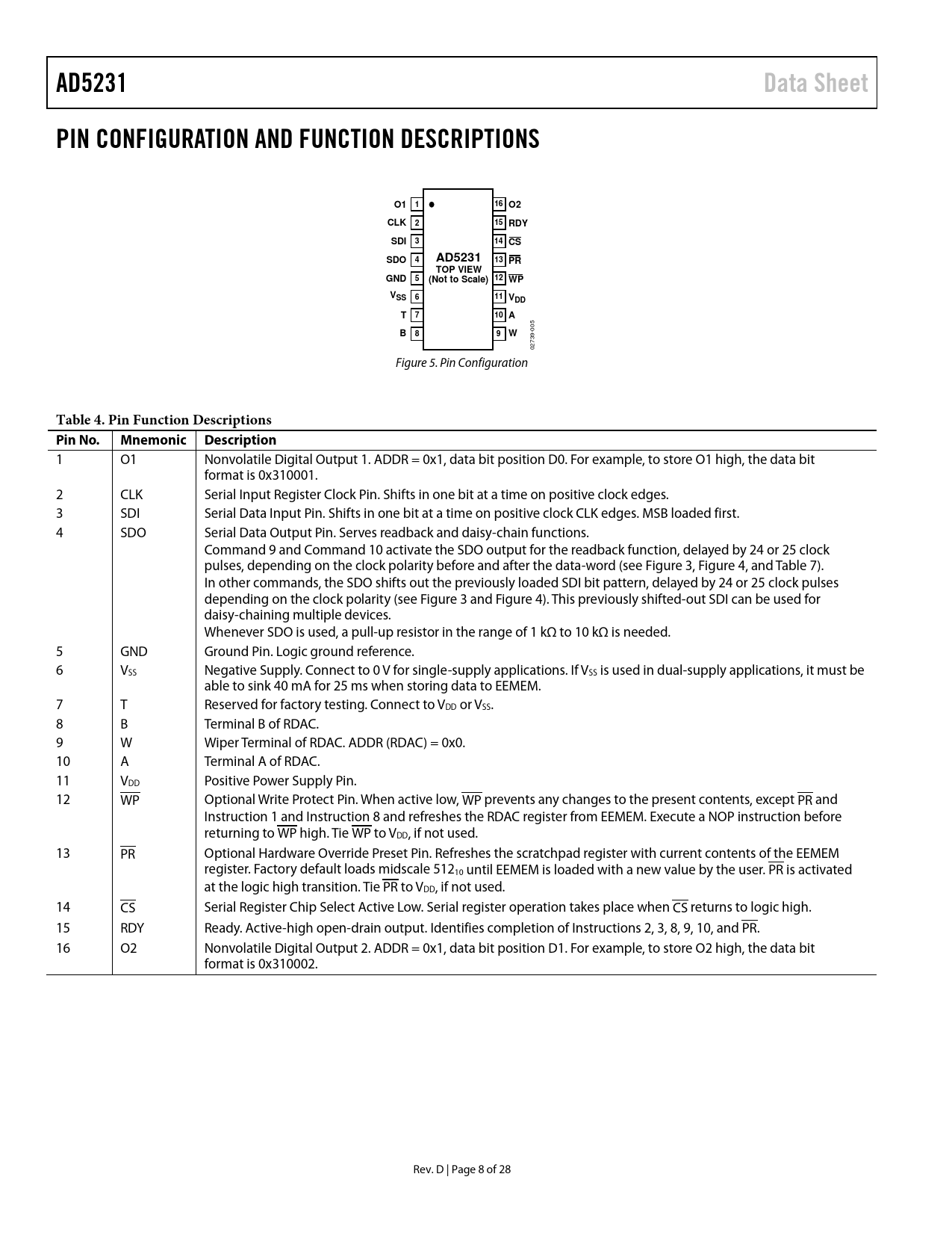 AD5231. Data Sheet. PIN CONFIGURATION AND FUNCTION DESCRIPTIONS. O1 1. 16 O2. CLK 2. 15 RDY. SDI. 14 CS. SDO. 13 PR. TOP VIEW. GND 5