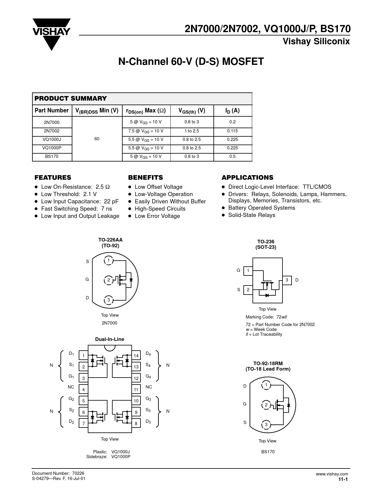 Datasheet 2N7000, 2N7002, VQ1000J, VQ1000P, BS170 Vishay
