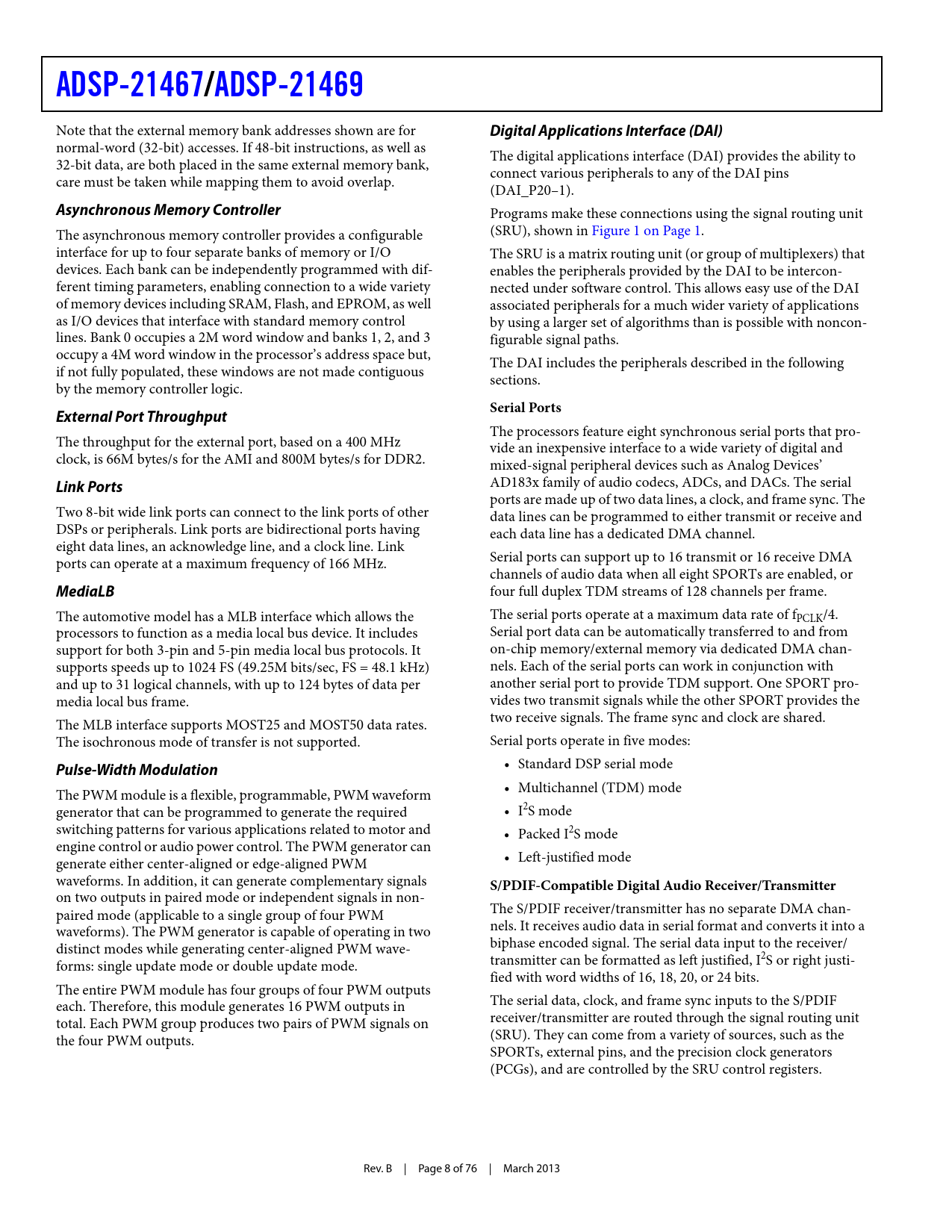 ADSP-21467/ ADSP-21469 Digital Applications Interface (DAI) Asynchronous Memory Controller Serial Ports