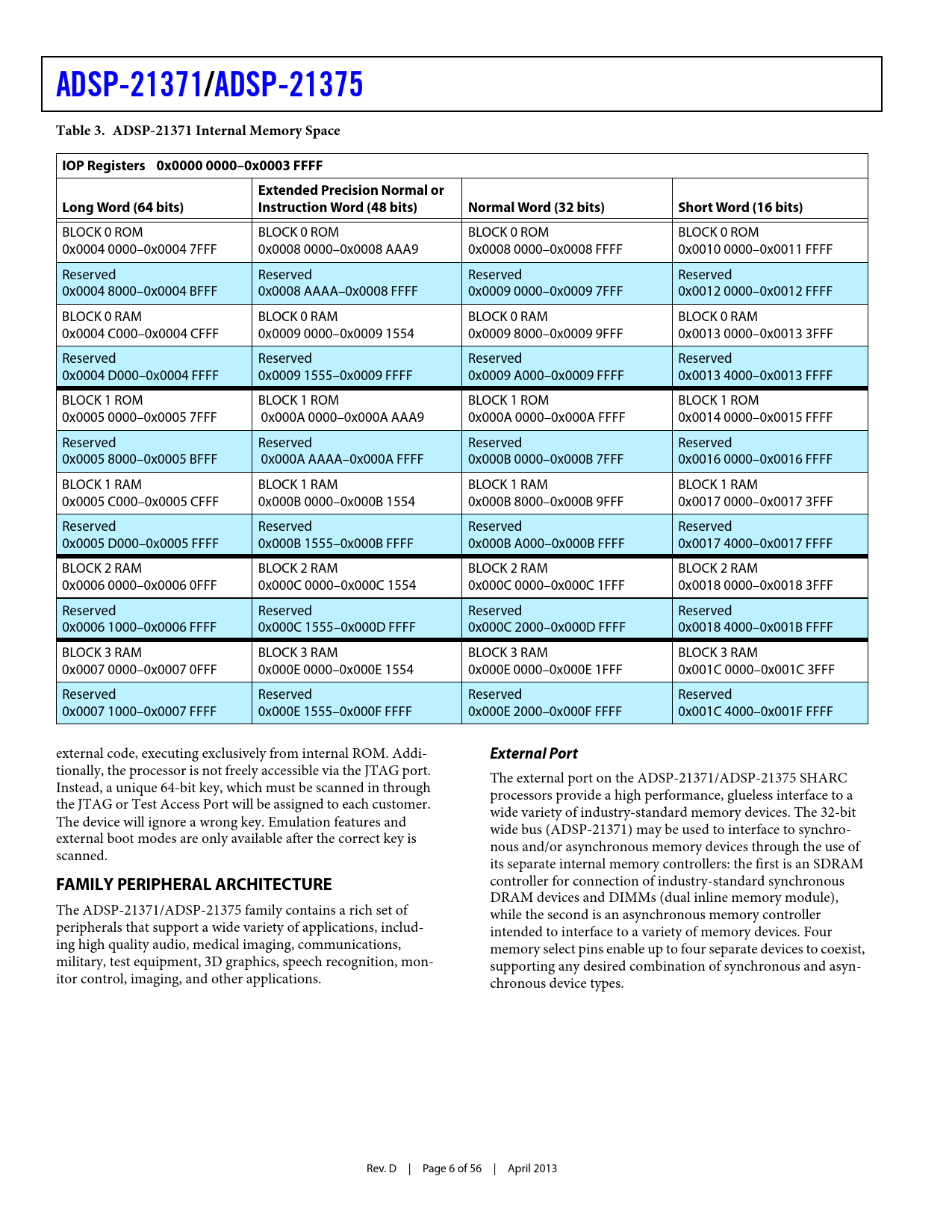 ADSP-21371/ ADSP-21375 Table 3. ADSP-21371 Internal Memory Space IOP Registers 0x0000 0000–0x0003 FFFF Extended Precision Normal or Long Word (64 bits) Instruction Word (48 bits) Normal Word (32 bits) Short Word (16 bits)