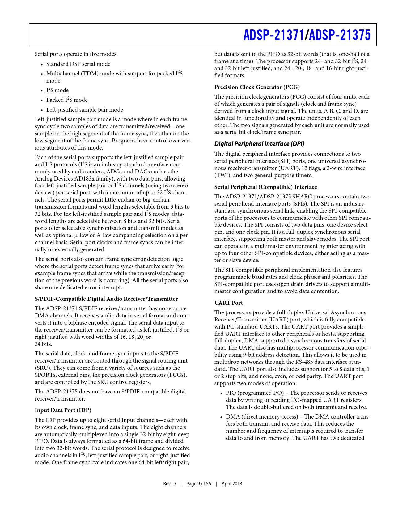 ious attributes of this mode. The digital peripheral interface provides connections to two Each of the serial ports supports the left-justified sample pair serial peripheral interface (SPI) ports, one universal asynchro- and I2S protocols (I2S is an industry-standard interface com- nous receiver-transmitter (UART), 12 flags, a 2-wire interface monly used by audio codecs, ADCs, and DACs such as the (TWI), and two general-purpose timers. Analog Devices AD183x family), with two data pins, allowing four left-justified sample pair or I2S channels (using two stereo