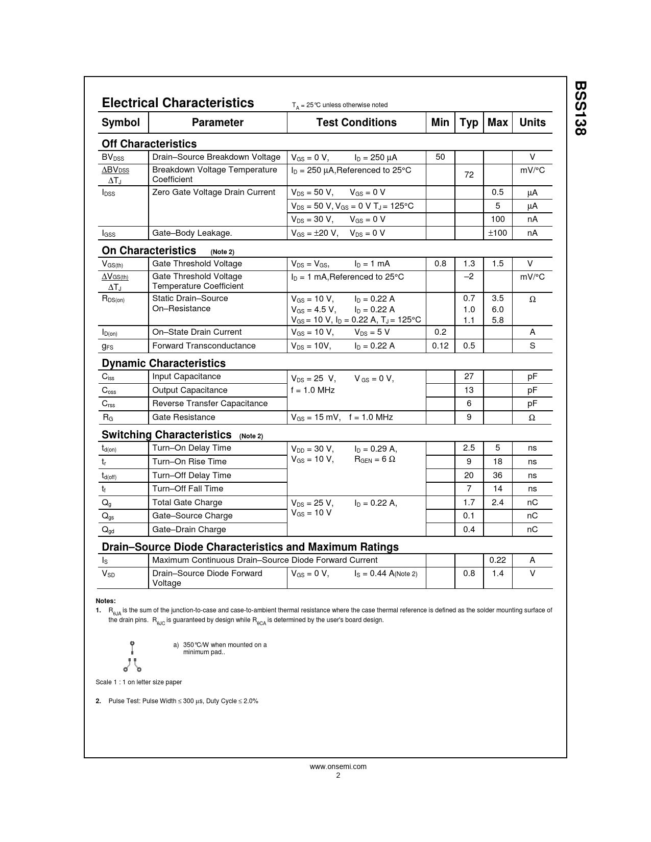 B SS138Electrical Characteristics T = 25°C unless otherwise noted A SymbolParameterTestConditionsMinTyp MaxUnitsOff Characteristics BVDSS Drain–Source Breakdown Voltage VGS = 0 V, ID = 250 µA 50 V ∆BVDSS Breakdown Voltage Temperature ID = 250 µA,Referenced to 25°C mV/°C ∆ 72 TJ Coefficient IDSS Zero Gate Voltage Drain Current VDS = 50 V, VGS = 0 V 0.5 µA VDS = 50 V, VGS = 0 V TJ = 125°C 5 µA VDS = 30 V, VGS = 0 V 100 nA IGSS Gate–Body Leakage. VGS = ±20 V, VDS = 0 V ±100 nA On Characteristics(Note 2) VGS(th) Gate Threshold Voltage VDS = VGS, ID = 1 mA 0.8 1.3 1.5 V ∆VGS(th) Gate Threshold Voltage ID = 1 mA,Referenced to 25°C –2 mV/°C ∆TJ Temperature Coefficient RDS(on) Static Drain–Source VGS = 10 V, ID = 0.22 A 0.7 3.5 Ω On–Resistance VGS = 4.5 V, ID = 0.22 A 1.0 6.0 VGS = 10 V, ID = 0.22 A, TJ = 125°C 1.1 5.8 ID(on) On–State Drain Current VGS = 10 V, VDS = 5 V 0.2 A gFS Forward Transconductance VDS = 10V, ID = 0.22 A 0.12 0.5 S Dynamic Characteristics Ciss Input Capacitance 27 pF VDS = 25 V, V GS = 0 V, Coss Output Capacitance f = 1.0 MHz 13 pF Crss Reverse Transfer Capacitance 6 pF RG Gate Resistance VGS = 15 mV, f = 1.0 MHz 9 Ω Switching Characteristics (Note 2) td(on) Turn–On Delay Time V 2.5 5 ns DD = 30 V, ID = 0.29 A, t V r Turn–On Rise Time GS = 10 V, RGEN = 6 Ω 9 18 ns td(off) Turn–Off Delay Time 20 36 ns tf Turn–Off Fall Time 7 14 ns Qg Total Gate Charge V 1.7 2.4 nC DS = 25 V, ID = 0.22 A, Q VGS = 10 V gs Gate–Source Charge 0.1 nC Qgd Gate–Drain Charge 0.4 nC Drain–Source Diode Characteristics and Maximum Ratings IS Maximum Continuous Drain–Source Diode Forward Current 0.22 A VSD Drain–Source Diode Forward VGS = 0 V, IS = 0.44 A(Note 2) 0.8 1.4 V Voltage Notes:1. Rθ is the sum of the junction-to-case and case-to-ambient thermal resistance where the case thermal reference is defined as the solder mounting surface of JA the drain pins. Rθ is guaranteed by design while R is determined by the user's board design. JC θCA a) 350°C/W when mounted on a minimum pad.. Scale 1 : 1 on letter size paper 2. Pulse Test: Pulse Width ≤ 300 µs, Duty Cycle ≤ 2.0% www.onsemi.com 2
