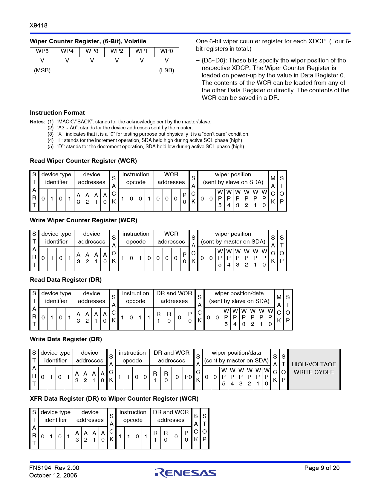 S device type device instruction DR and WCR S S S T identifier addresses opcode addresses A A T A C C O R 0 1 0 1 A A A A R 3 2 1 0 K 1 1 0 1 R 1 0 0 P 0 K P T FN8194 Rev 2.00 Page 9 of 20 October 12, 2006