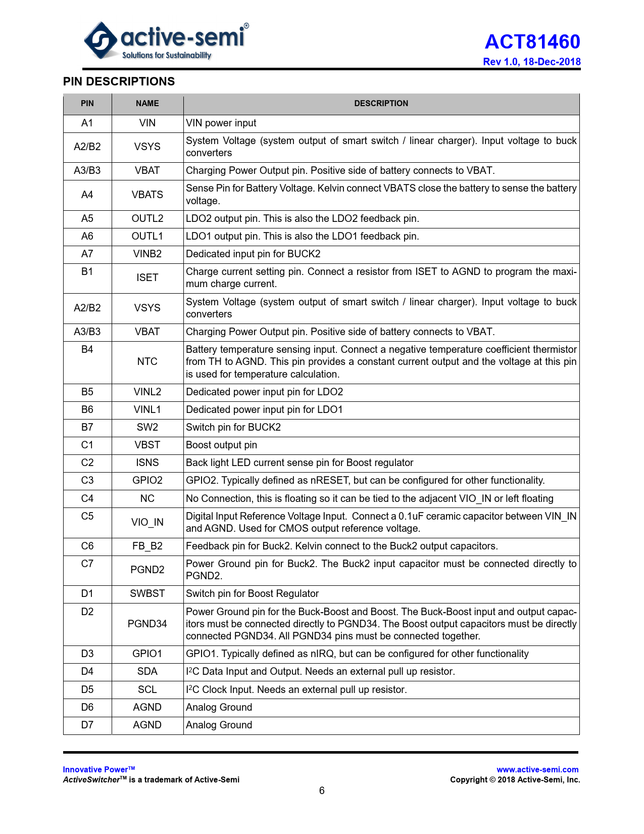 ACT81460. Rev 1.0, 18-Dec-2018. PIN DESCRIPTIONS. PIN. NAME. DESCRIPTION. Innovative PowerTM. www.active-semi.com. ActiveSwitcher