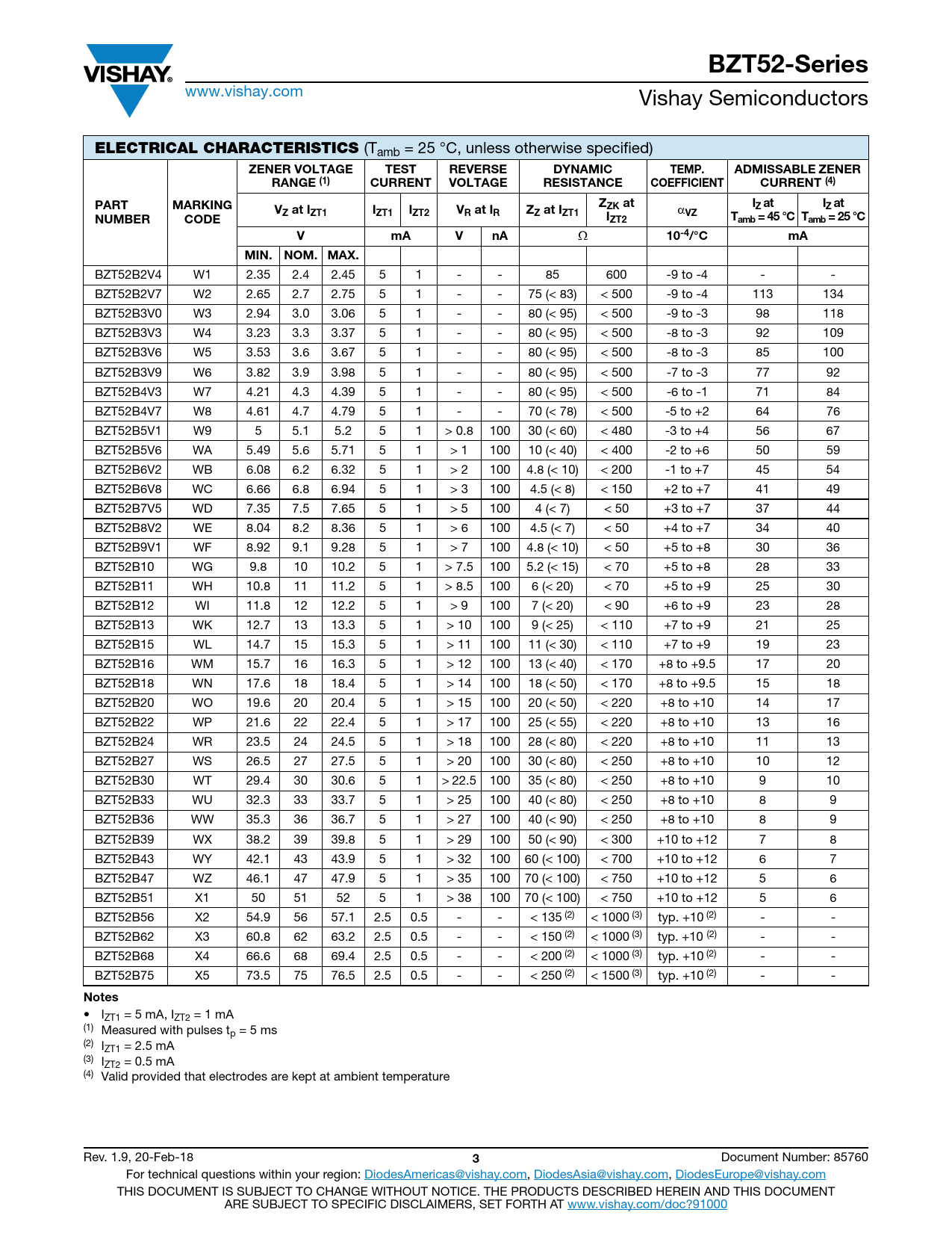 BZT52B2V4 W1 2.35 2.4 2.45 5 1 - - 85 600 -9 to -4 - - BZT52B2V7 W2 2.65 2.7 2.75 5 1 - - 75 (< 83) < 500 -9 to -4 113 134 BZT52B3V0 W3 2.94 3.0 3.06 5 1 - - 80 (< 95) < 500 -9 to -3 98 118 BZT52B3V3 W4 3.23 3.3 3.37 5 1 - - 80 (< 95) < 500 -8 to -3 92 109 BZT52B3V6 W5 3.53 3.6 3.67 5 1 - - 80 (< 95) < 500 -8 to -3 85 100 BZT52B3V9 W6 3.82 3.9 3.98 5 1 - - 80 (< 95) < 500 -7 to -3 77 92 BZT52B4V3 W7 4.21 4.3 4.39 5 1 - - 80 (< 95) < 500 -6 to -1 71 84 BZT52B4V7 W8 4.61 4.7 4.79 5 1 - - 70 (< 78) < 500 -5 to +2 64 76 BZT52B5V1 W9 5 5.1 5.2 5 1 > 0.8 100 30 (< 60) < 480 -3 to +4 56 67 BZT52B5V6 WA 5.49 5.6 5.71 5 1 > 1 100 10 (< 40) < 400 -2 to +6 50 59 BZT52B6V2 WB 6.08 6.2 6.32 5 1 > 2 100 4.8 (< 10) < 200 -1 to +7 45 54 BZT52B6V8 WC 6.66 6.8 6.94 5 1 > 3 100 4.5 (< 8) < 150 +2 to +7 41 49 BZT52B7V5 WD 7.35 7.5 7.65 5 1 > 5 100 4 (< 7) < 50 +3 to +7 37 44 BZT52B8V2 WE 8.04 8.2 8.36 5 1 > 6 100 4.5 (< 7) < 50 +4 to +7 34 40 BZT52B9V1 WF 8.92 9.1 9.28 5 1 > 7 100 4.8 (< 10) < 50 +5 to +8 30 36 BZT52B10 WG 9.8 10 10.2 5 1 > 7.5 100 5.2 (< 15) < 70 +5 to +8 28 33 BZT52B11 WH 10.8 11 11.2 5 1 > 8.5 100 6 (< 20) < 70 +5 to +9 25 30 BZT52B12 WI 11.8 12 12.2 5 1 > 9 100 7 (< 20) < 90 +6 to +9 23 28 BZT52B13 WK 12.7 13 13.3 5 1 > 10 100 9 (< 25) < 110 +7 to +9 21 25 BZT52B15 WL 14.7 15 15.3 5 1 > 11 100 11 (< 30) < 110 +7 to +9 19 23 BZT52B16 WM 15.7 16 16.3 5 1 > 12 100 13 (< 40) < 170 +8 to +9.5 17 20 BZT52B18 WN 17.6 18 18.4 5 1 > 14 100 18 (< 50) < 170 +8 to +9.5 15 18 BZT52B20 WO 19.6 20 20.4 5 1 > 15 100 20 (< 50) < 220 +8 to +10 14 17 BZT52B22 WP 21.6 22 22.4 5 1 > 17 100 25 (< 55) < 220 +8 to +10 13 16 BZT52B24 WR 23.5 24 24.5 5 1 > 18 100 28 (< 80) < 220 +8 to +10 11 13 BZT52B27 WS 26.5 27 27.5 5 1 > 20 100 30 (< 80) < 250 +8 to +10 10 12 BZT52B30 WT 29.4 30 30.6 5 1 > 22.5 100 35 (< 80) < 250 +8 to +10 9 10 BZT52B33 WU 32.3 33 33.7 5 1 > 25 100 40 (< 80) < 250 +8 to +10 8 9 BZT52B36 WW 35.3 36 36.7 5 1 > 27 100 40 (< 90) < 250 +8 to +10 8 9 BZT52B39 WX 38.2 39 39.8 5 1 > 29 100 50 (< 90) < 300 +10 to +12 7 8 BZT52B43 WY 42.1 43 43.9 5 1 > 32 100 60 (< 100) < 700 +10 to +12 6 7 BZT52B47 WZ 46.1 47 47.9 5 1 > 35 100 70 (< 100) < 750 +10 to +12 5 6 BZT52B51 X1 50 51 52 5 1 > 38 100 70 (< 100) < 750 +10 to +12 5 6 BZT52B56 X2 54.9 56 57.1 2.5 0.5 - - < 135 (2) < 1000 (3) typ. +10 (2) - - BZT52B62 X3 60.8 62 63.2 2.5 0.5 - - < 150 (2) < 1000 (3) typ. +10 (2) - - BZT52B68 X4 66.6 68 69.4 2.5 0.5 - - < 200 (2) < 1000 (3) typ. +10 (2) - - BZT52B75 X5 73.5 75 76.5 2.5 0.5 - - < 250 (2) < 1500 (3) typ. +10 (2) - -