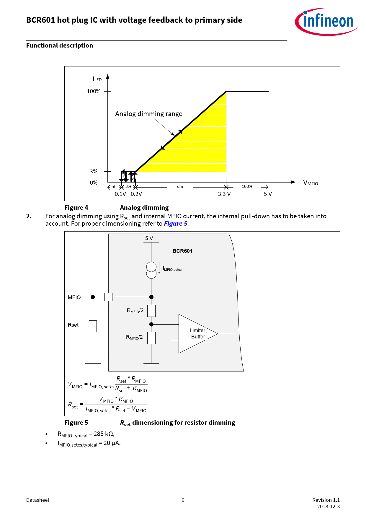 For analog dimming using Rset and internal MFIO current, the internal pull-down has to be taken into account. For proper dimensioning refer to