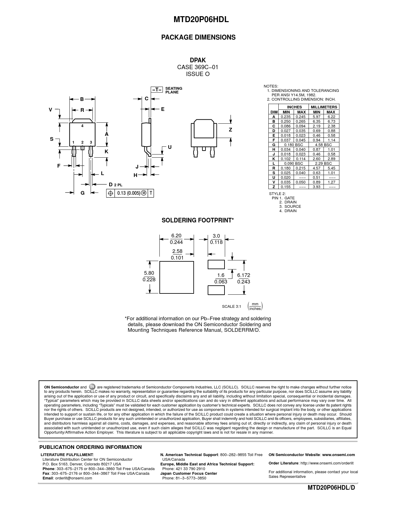 MTD20P06HDL. PACKAGE DIMENSIONS. DPAK. −T− SEATING. PLANE. INCHES. MILLIMETERS. DIM. MIN. MAX. D 2 PL. SOLDERING FOOTPRINT*. ON Semiconductor