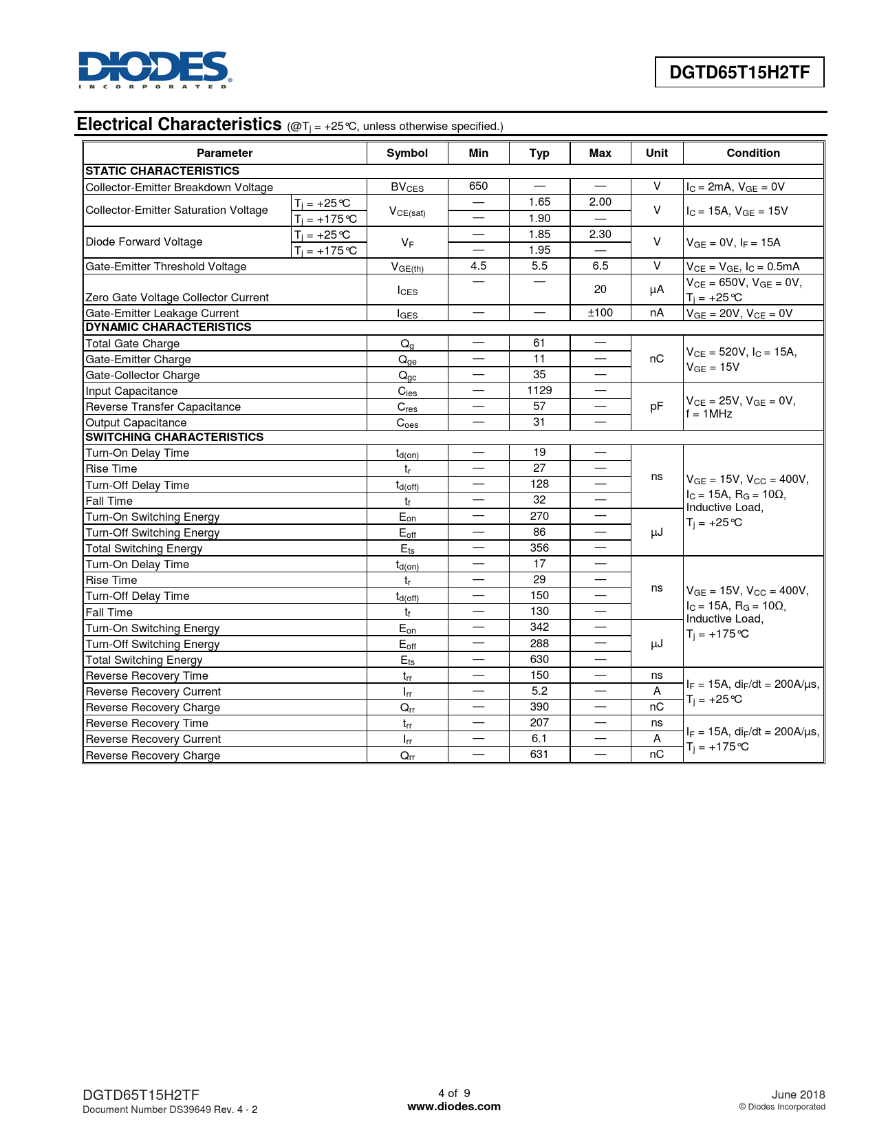 DGTD65T15H2TF. Electrical Characteristics. Parameter. Symbol. Min. Typ. Max. Unit. Condition. STATIC CHARACTERISTICS