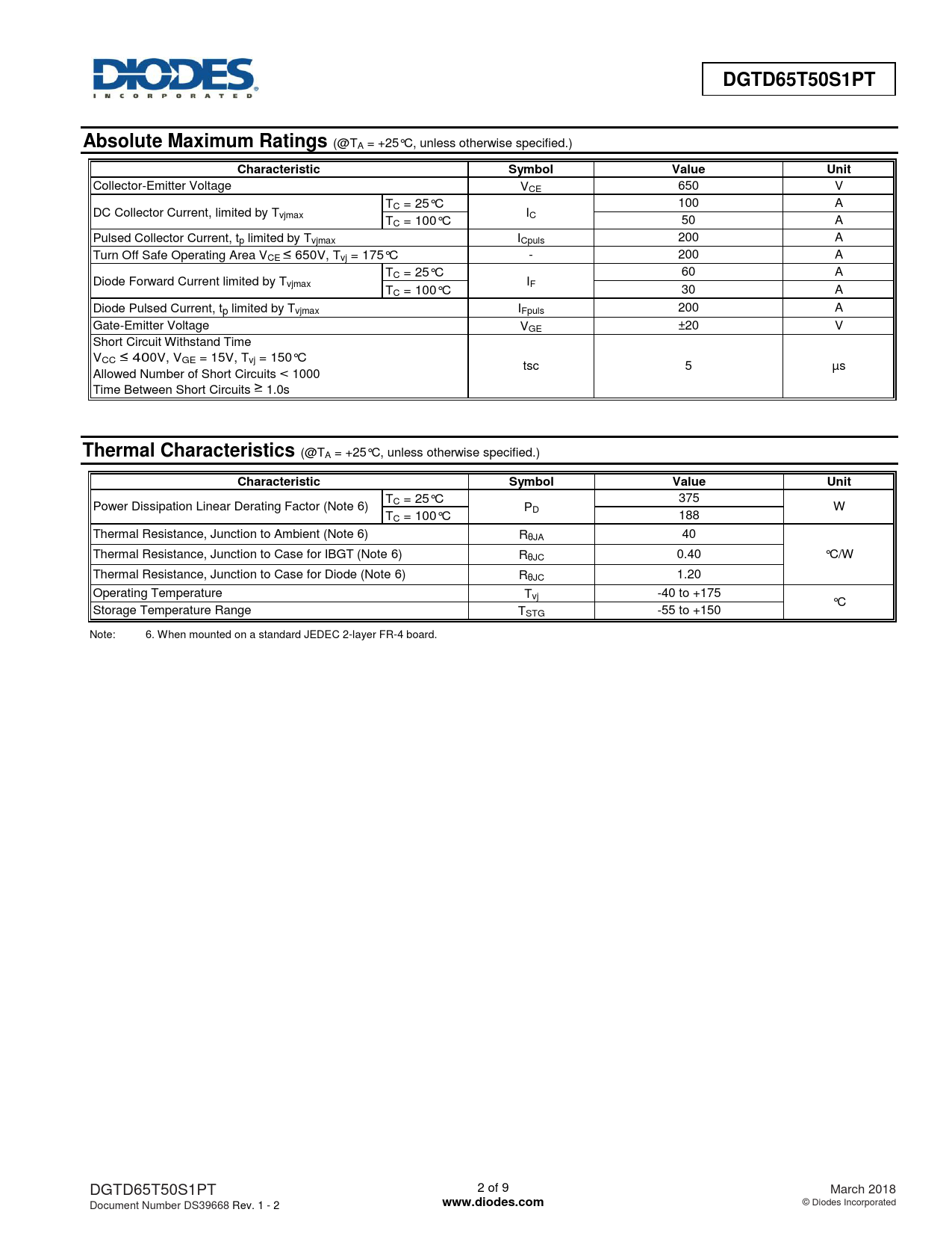 375 Power Dissipation Linear Derating Factor (Note 6) TC = 25°C PD W TC = 100°C 188 Thermal Resistance, Junction to Ambient (Note 6) RθJA 40 Thermal Resistance, Junction to Case for IBGT (Note 6) RθJC 0.40 °C/W Thermal Resistance, Junction to Case for Diode (Note 6) RθJC 1.20 Operating Temperature Tvj -40 to +175 °C Storage Temperature Range TSTG -55 to +150 Note: 6. When mounted on a standard JEDEC 2-layer FR-4 board. DGTD65T50S1PT 2 of 9 March 2018 Document Number DS39668 Rev. 1 - 2