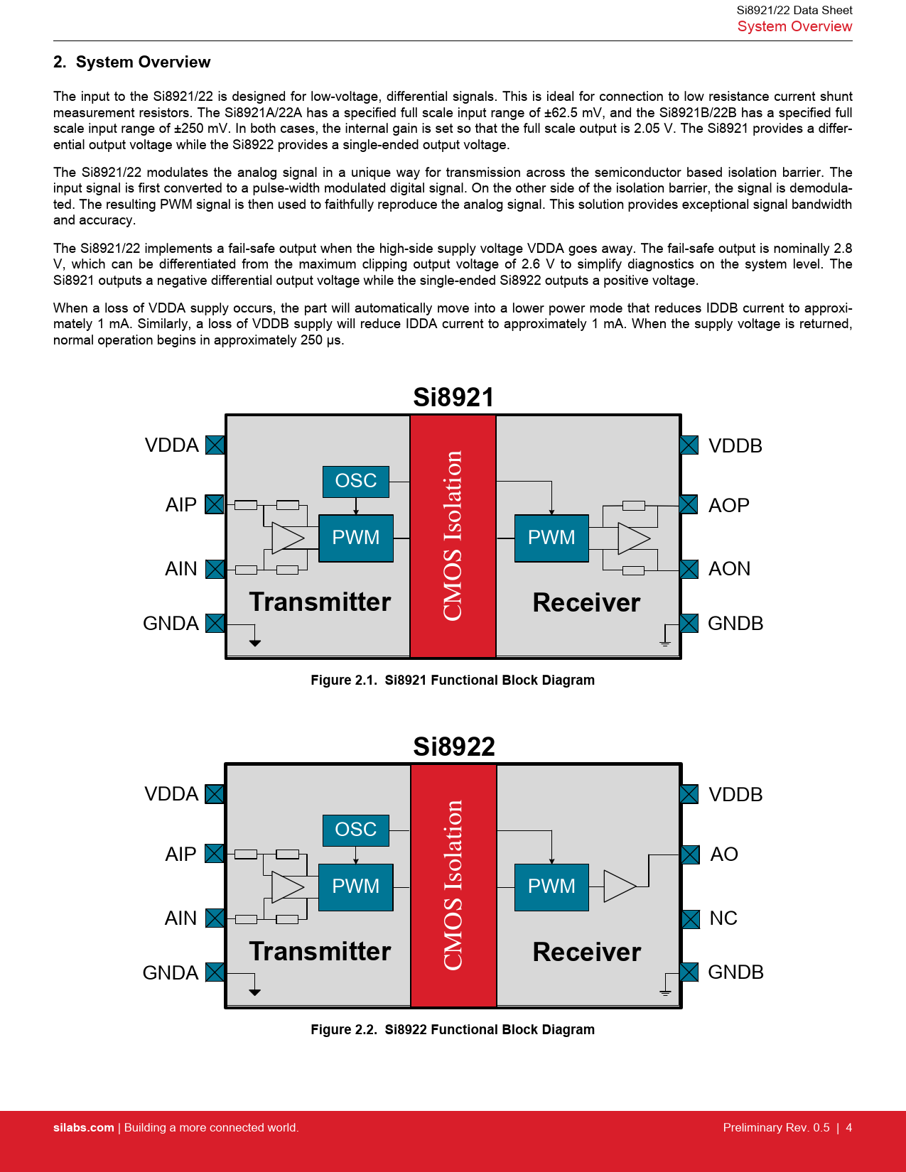 Si8921/22 Data Sheet System Overview 2. System Overview The input to the Si8921/22 is designed for low-voltage, differential signals. This is ideal for connection to low resistance current shunt measurement resistors. The Si8921A/22A has a specified full scale input range of ±62.5 mV, and the Si8921B/22B has a specified full scale input range of ±250 mV. In both cases, the internal gain is set so that the full scale output is 2.05 V. The Si8921 provides a differ- ential output voltage while the Si8922 provides a single-ended output voltage. The Si8921/22 modulates the analog signal in a unique way for transmission across the semiconductor based isolation barrier. The input signal is first converted to a pulse-width modulated digital signal. On the other side of the isolation barrier, the signal is demodula- ted. The resulting PWM signal is then used to faithfully reproduce the analog signal. This solution provides exceptional signal bandwidth and accuracy. The Si8921/22 implements a fail-safe output when the high-side supply voltage VDDA goes away. The fail-safe output is nominally 2.8 V, which can be differentiated from the maximum clipping output voltage of 2.6 V to simplify diagnostics on the system level. The Si8921 outputs a negative differential output voltage while the single-ended Si8922 outputs a positive voltage. When a loss of VDDA supply occurs, the part will automatically move into a lower power mode that reduces IDDB current to approxi- mately 1 mA. Similarly, a loss of VDDB supply will reduce IDDA current to approximately 1 mA. When the supply voltage is returned, normal operation begins in approximately 250 μs. Si8921 VDDA VDDB OSC AIP AOP PWM PWM AIN AON TransmitterReceiver GNDA CMOS Isolation GNDB Figure 2.1. Si8921 Functional Block DiagramSi8922 VDDA VDDB OSC AIP AO PWM PWM AIN NC TransmitterReceiver GNDA CMOS Isolation GNDB Figure 2.2. Si8922 Functional Block Diagramsilabs.com | Building a more connected world. Preliminary Rev. 0.5 | 4 Document Outline 1. Ordering Guide 2. System Overview 3. Current Sense Application 4. Electrical Specifications 4.1 Regulatory Information 4.2 Typical Operating Characteristics 5. Pin Descriptions 5.1 Si8921 Pin Descriptions 5.2 Si8922 Pin Descriptions 6. Packaging 6.1 Package Outline: 8-Pin Wide Body Stretched SOIC 6.2 Package Outline: 8-Pin Narrow Body SOIC 6.3 Land Pattern: 8-Pin Wide Body Stretched SOIC 6.4 Land Pattern: 8-Pin Narrow Body SOIC 6.5 Top Marking: 8-Pin Wide Body Stretched SOIC 6.6 Top Marking: 8-Pin Narrow Body SOIC 7. Revision History