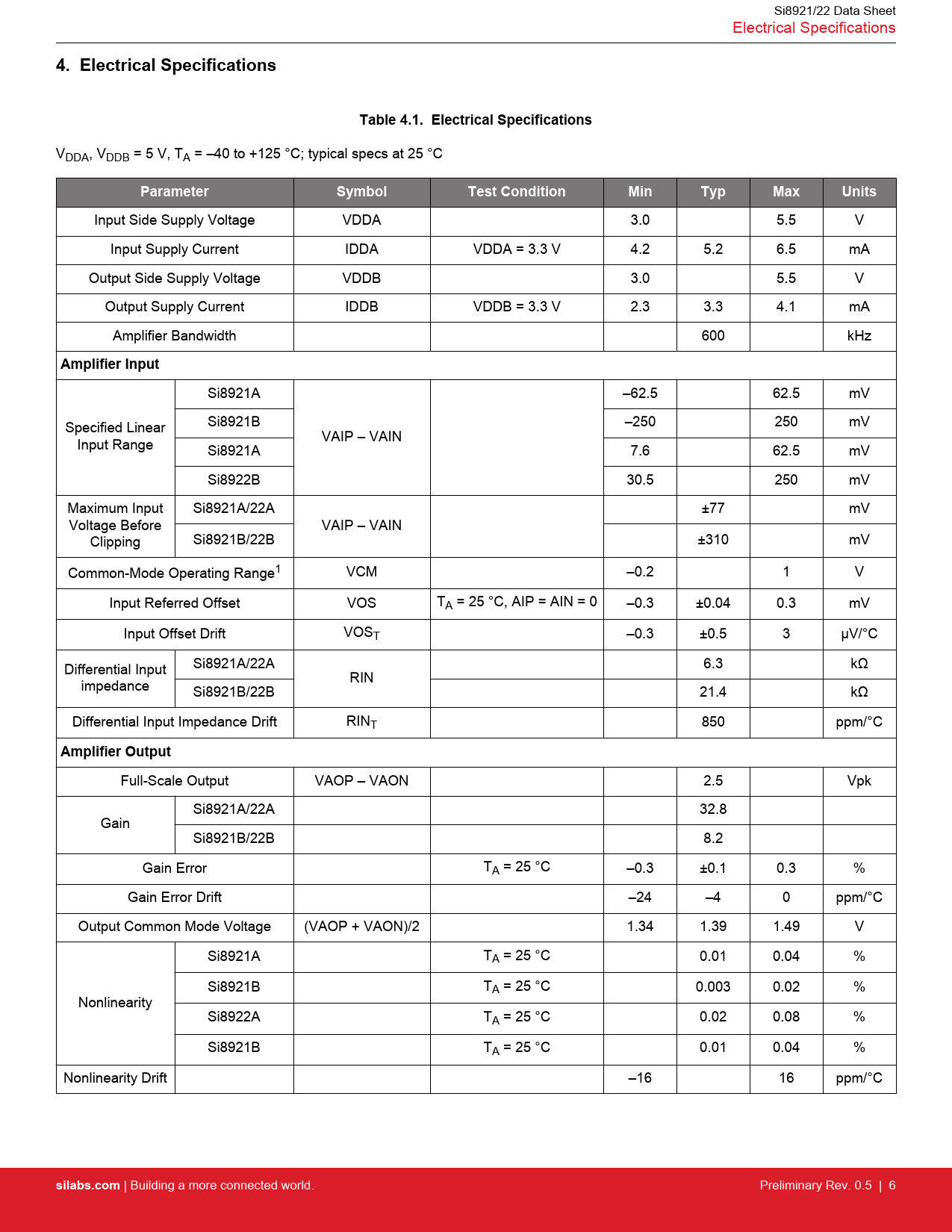 Si8921A –62.5 62.5 mV Specified Linear Si8921B –250 250 mV VAIP – VAIN Input Range Si8921A 7.6 62.5 mV Si8922B 30.5 250 mV Maximum Input Si8921A/22A ±77 mV Voltage Before VAIP – VAIN Clipping Si8921B/22B ±310 mV Common-Mode Operating Range1 VCM –0.2 1 V Input Referred Offset VOS TA = 25 °C, AIP = AIN = 0 –0.3 ±0.04 0.3 mV Input Offset Drift VOST –0.3 ±0.5 3 µV/°C Differential Input Si8921A/22A 6.3 kΩ RIN impedance Si8921B/22B 21.4 kΩ Differential Input Impedance Drift RINT 850 ppm/°C