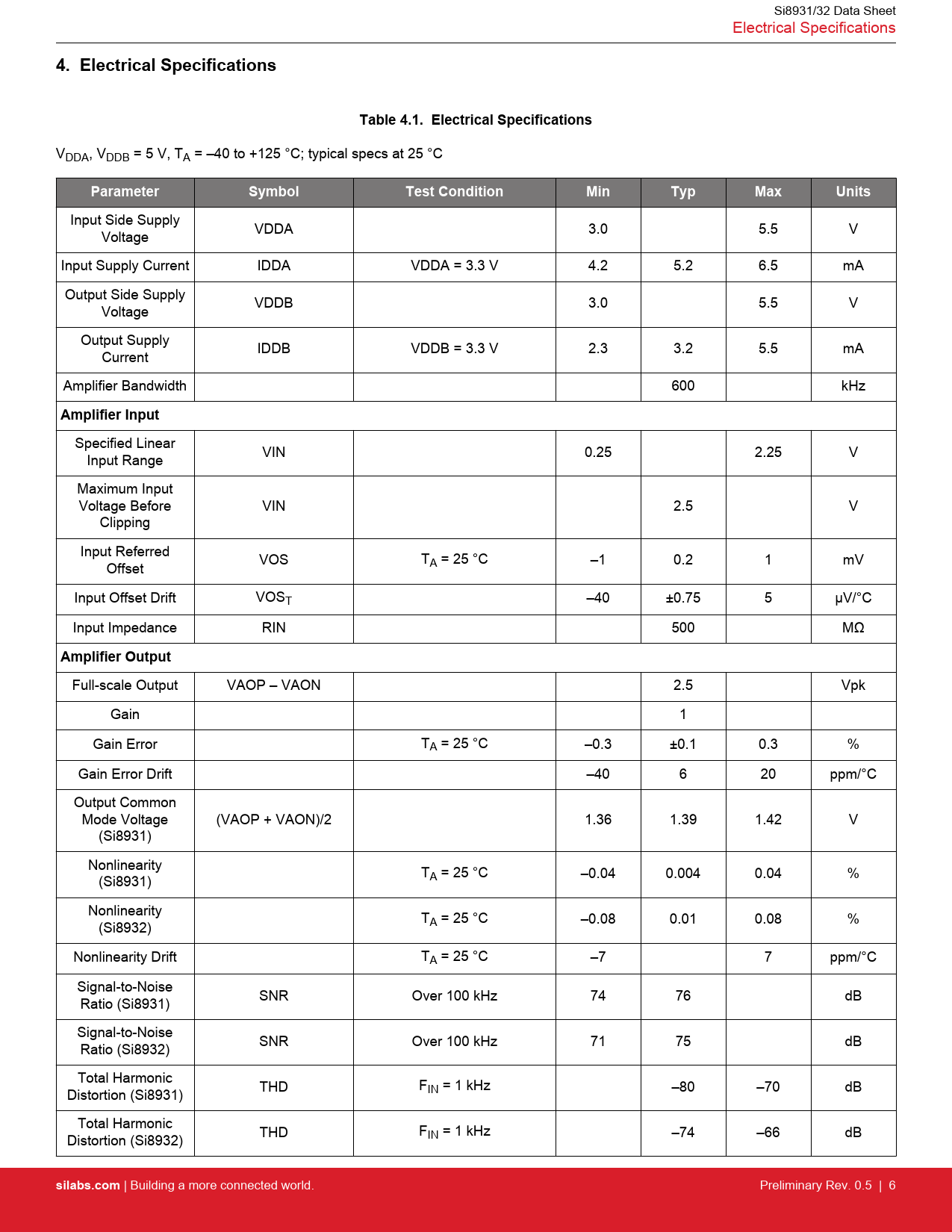4. Electrical Specifications. Table 4.1. Electrical Specifications. Parameter. Symbol. Test Condition. Min. Typ. Max. Units