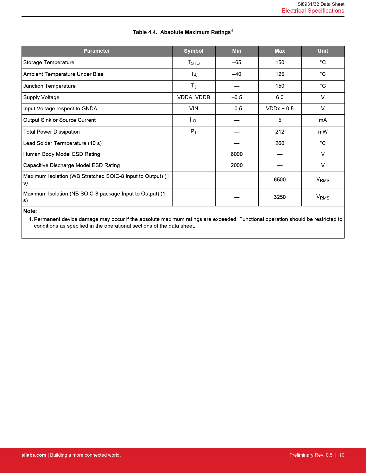 Table 4.4. Absolute Maximum Ratings1. Parameter. Symbol. Min. Max. Unit. Note:. silabs.com