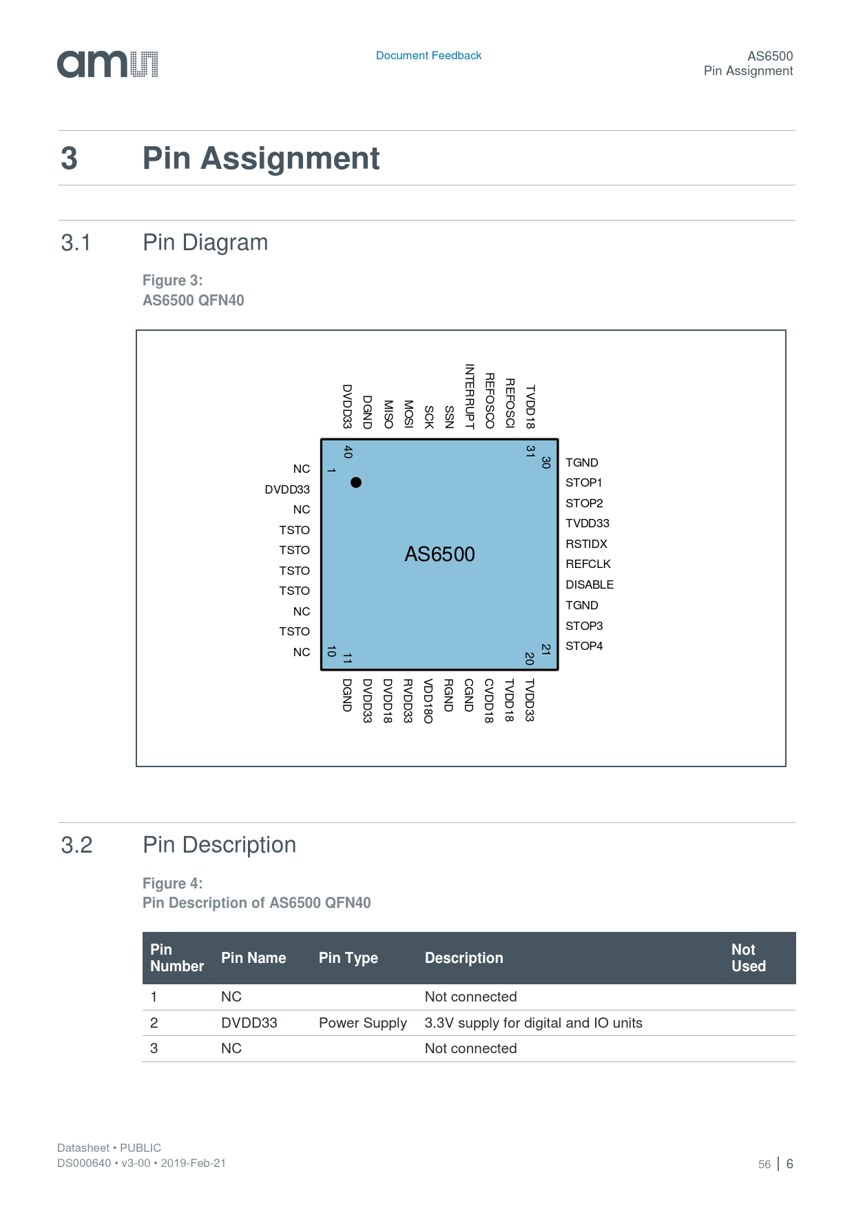 Páginas / Página56 / 6 — Pin Assignment. Figure 3: AS6500 QFN40. Figure 4: Pin Description of …