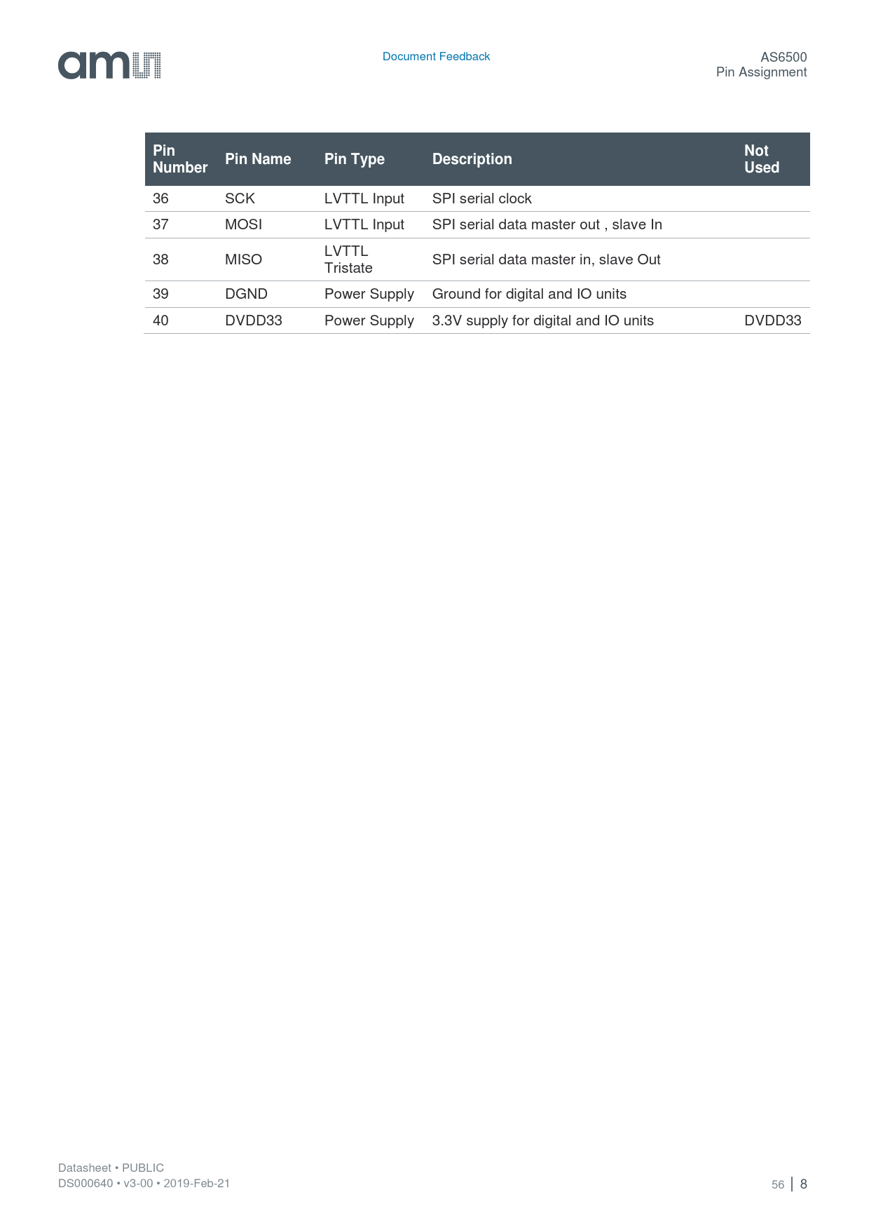 36 SCK LVTTL Input SPI serial clock 37 MOSI LVTTL Input SPI serial data master out , slave In LVTTL 38 MISO SPI serial data master in, slave Out Tristate 39 DGND Power Supply Ground for digital and IO units 40 DVDD33 Power Supply 3.3V supply for digital and IO units DVDD33 Datasheet • PUBLIC DS000640 • v3-00 • 2019-Feb-21 56 │ 8 Document Outline Content Guide 1 General Description 1.1 Key Benefits & Features 1.2 Applications 1.3 Block Diagram 2 Ordering Information 3 Pin Assignment 3.1 Pin Diagram 3.2 Pin Description 4 Absolute Maximum Ratings 5 Recommended Operation Conditions 6 Typical Characteristics 6.1 Converter Characteristics 6.2 Power Supply Characteristics 6.3 Reference Clock and Stop Input Requirements 6.4 Serial Communication Interface 6.5 Typical Operating Characteristics 7 Register Description 7.1 Register Overview 7.2 Detailed Register Description 7.2.1 CFG0 Register (Address 0) 7.2.2 CFG1 Register (Address 1) 7.2.3 CFG2 Register (Address 2) 7.2.4 CFG3, CFG4, CFG5 Registers (Addresses 3 to 5) 7.2.5 CFG6 Register (Address 6) 7.2.6 CFG7 Register (Address 7) 7.2.7 CFG8 to CFG15 Register (Addresses 8 to 15) 7.2.8 CFG16 Register (Address 16) 7.2.9 CHANNEL1 Result Register (Addresses 8 to 13) 7.2.10 CHANNEL2 Result Register (Addresses 14 to 19) 7.2.11 CHANNEL3 Result Register (Addresses 20 to 25) 7.2.12 CHANNEL4 Result Register (Addresses 26 to 31) 8 Detailed Description 8.1 Time Measurements and Results 8.1.1 Measurements of AS6500 8.1.2 Output Results 8.1.3 Calculation of Time Differences GENERAL APPROACH 8.2 Resolution 8.2.1 RMS-Resolution versus Effective Resolution 8.2.2 High Resolution 8.3 Combining Two Stop Channels 8.3.1 Channel Combination for Low Pulse-to-Pulse Spacing 8.3.2 Channel Combination for Pulse Width Measurement 8.4 Input Pins for Time Measurement 8.4.1 REFCLK: Reference Clock Input 8.4.2 RSTIDX: Reference Index Counter Reset 8.4.3 STOP1 to STOP4: Stop Channels 8.4.4 DISABLE: Stop Disable SOFTWARE ENABLE (HIT_ENA_STOP1…4) PIN ENABLE (PIN_ENA_XXX) 8.5 SPI Communication Interface 8.5.1 General 8.5.2 Detailed Pin Description 8.5.3 Communication Commands (Opcodes) 8.5.4 Data Readout via SPI Interface 8.6 Coding of Results 8.6.1 Configuration of LSB by REFCLK_DIVISIONS 8.6.2 Examples for Codes of Time Measurements Results 8.6.3 Maximum Time Differences 8.7 Conversion Latency and Conversion Rate Converter Latency 8.8 Conversion Rate 8.8.1 Peak Conversion Rate 8.8.2 Read-Out Rate 8.8.3 Average Conversion Rate 8.8.4 FIFOs for Adapting Peak and Average Conversion Rate 9 Application Information 9.1 Configuration Examples 9.2 Example C++ Code 9.3 Schematic 9.4 External Components 10 Package Drawings & Markings 11 Reel Information 12 Soldering & Storage Information 13 Revision Information 14 Legal Information