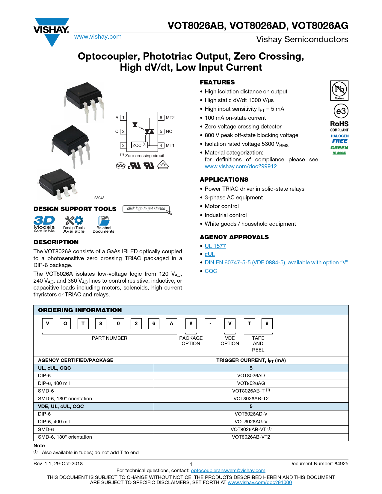 DIP-6 VOT8026AD DIP-6, 400 mil VOT8026AG SMD-6 VOT8026AB-T (1) SMD-6, 180° orientation VOT8026AB-T2