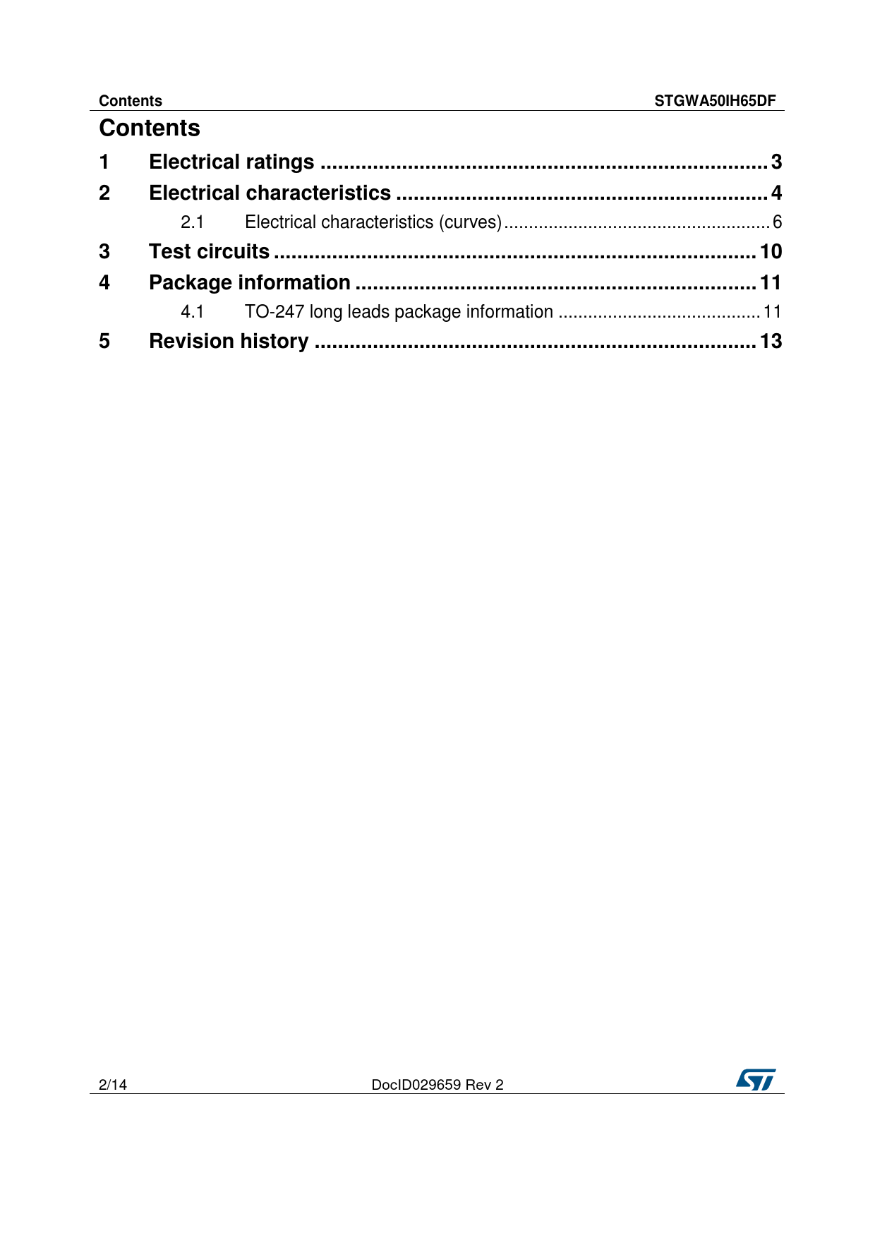 Contents STGWA50IH65DF Electrical ratings .. 3 Electrical characteristics . 4 Test circuits .. 10