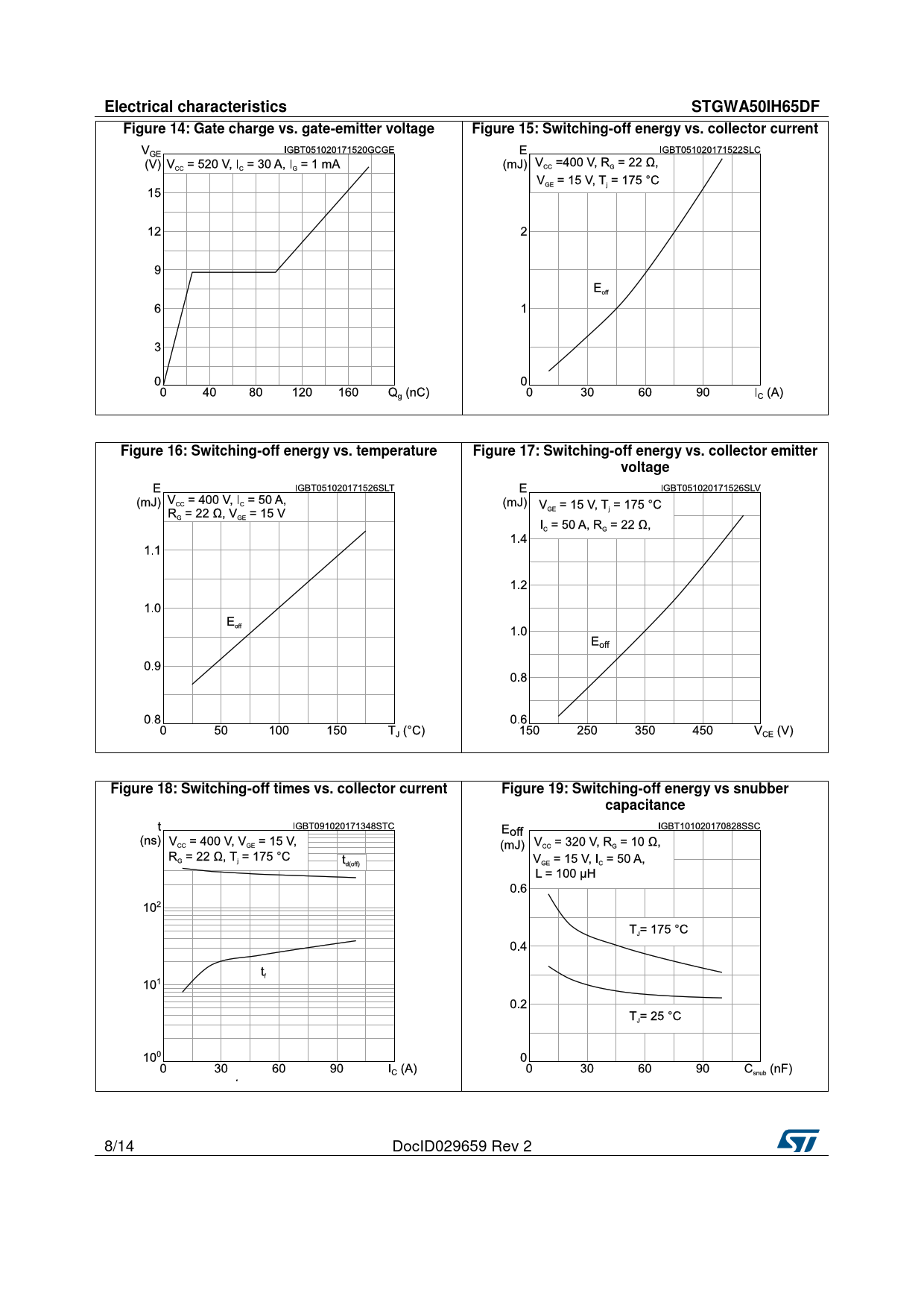 Electrical characteristics STGWA50IH65DF Figure 14: Gate charge vs. gate-emitter voltage Figure 15: Switching-off energy vs. collector current Figure 16: Switching-off energy vs. temperature Figure 17: Switching-off energy vs. collector emitter voltage Figure 18: Switching-off times vs. collector current Figure 19: Switching-off energy vs snubber capacitance