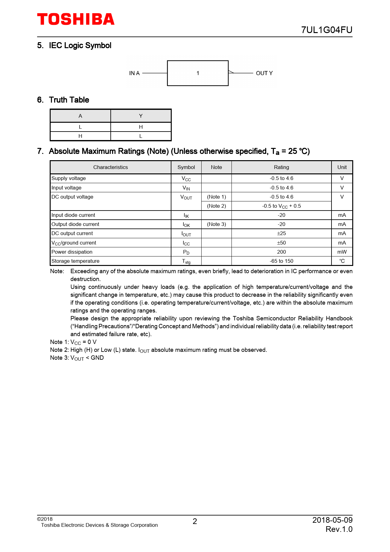 7UL1G04FU. 5. IEC. Logic. Symbol. 6. Truth. Table. A. Y. L. H. H. L. 7. Absolute. Maximum. Ratings. (Note). (Unless. otherwise. specified,. Ta. =. 25. ). Characteristics
