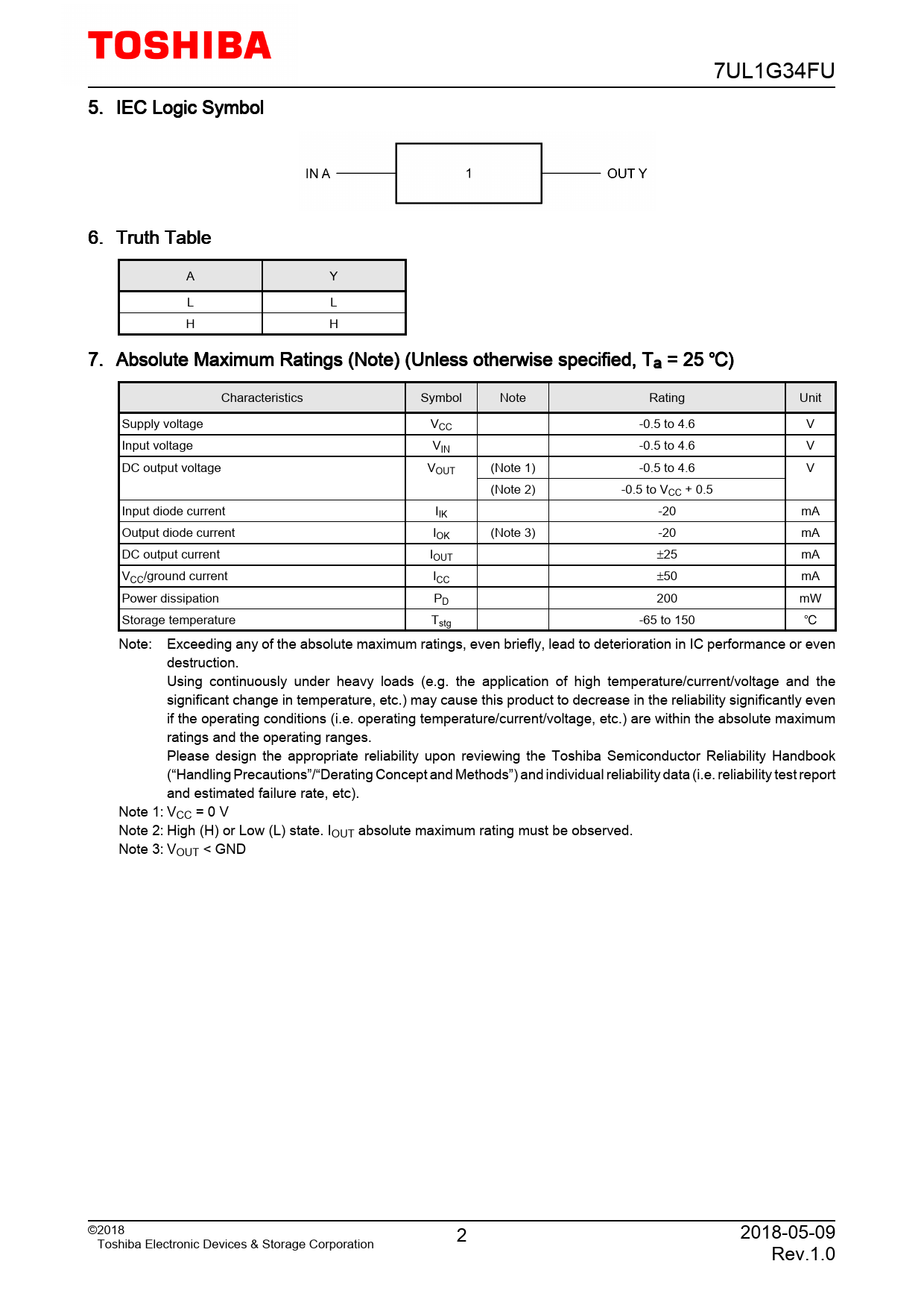 7UL1G34FU. 5. IEC. Logic. Symbol. 6. Truth. Table. A. Y. L. L. H. H. 7. Absolute. Maximum. Ratings. (Note). (Unless. otherwise. specified,. Ta. =. 25. ). Characteristics