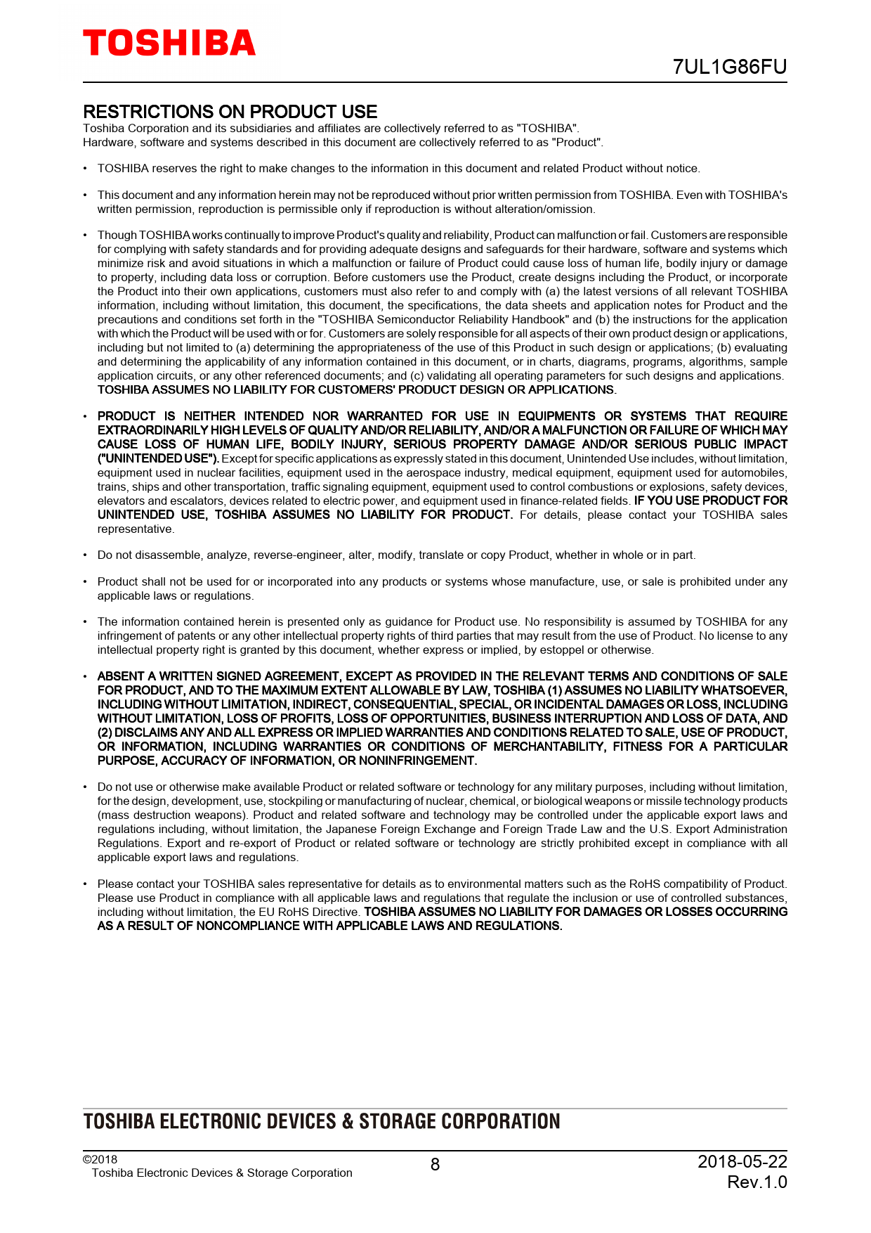 7UL1G86FU. RESTRICTIONS. ON. PRODUCT. USE. Toshiba. Corporation. and. its. subsidiaries. and. affiliates. are. collectively. referred. to. as