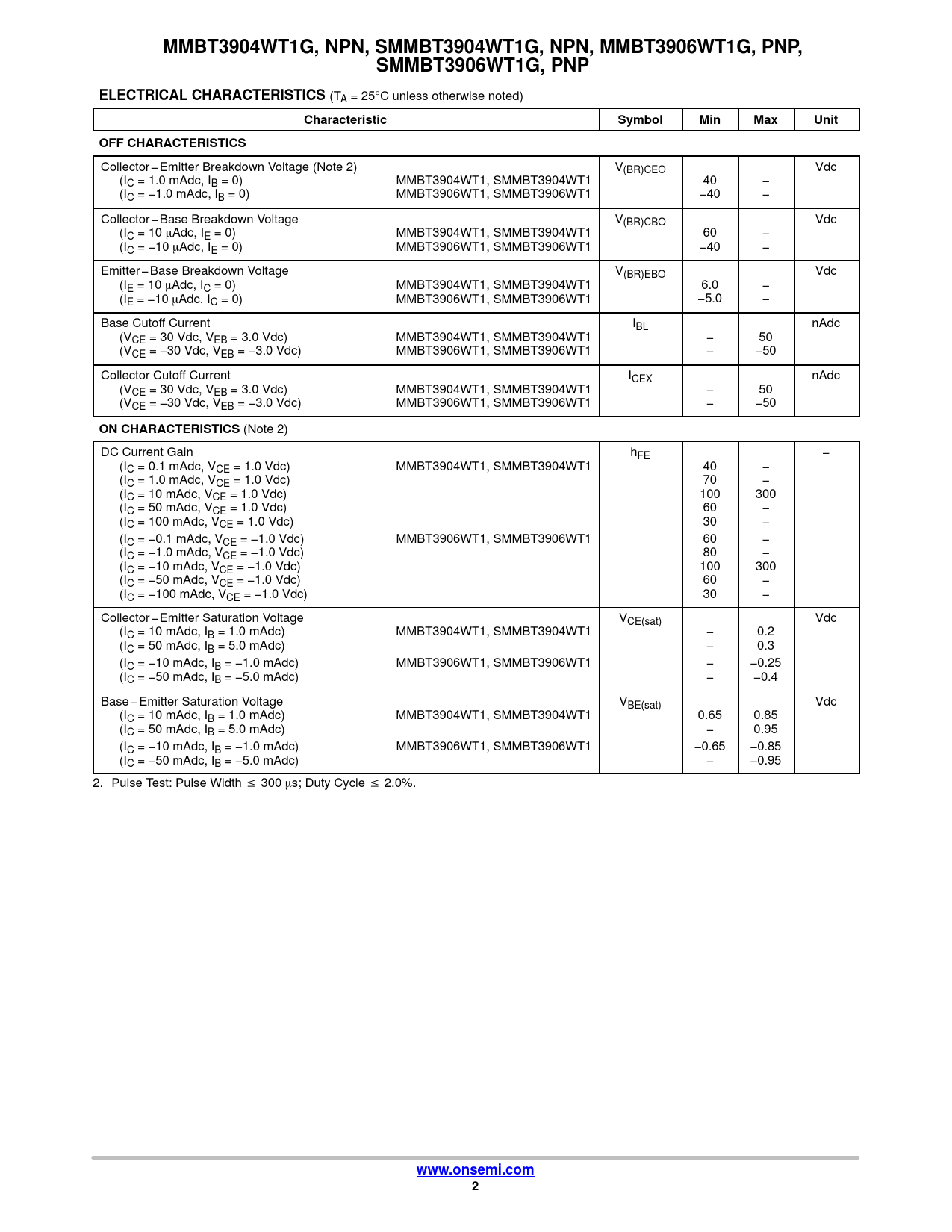 MMBT3904WT1G, NPN, SMMBT3904WT1G, NPN, MMBT3906WT1G, PNP,. SMMBT3906WT1G, PNP. ELECTRICAL CHARACTERISTICS. Characteristic