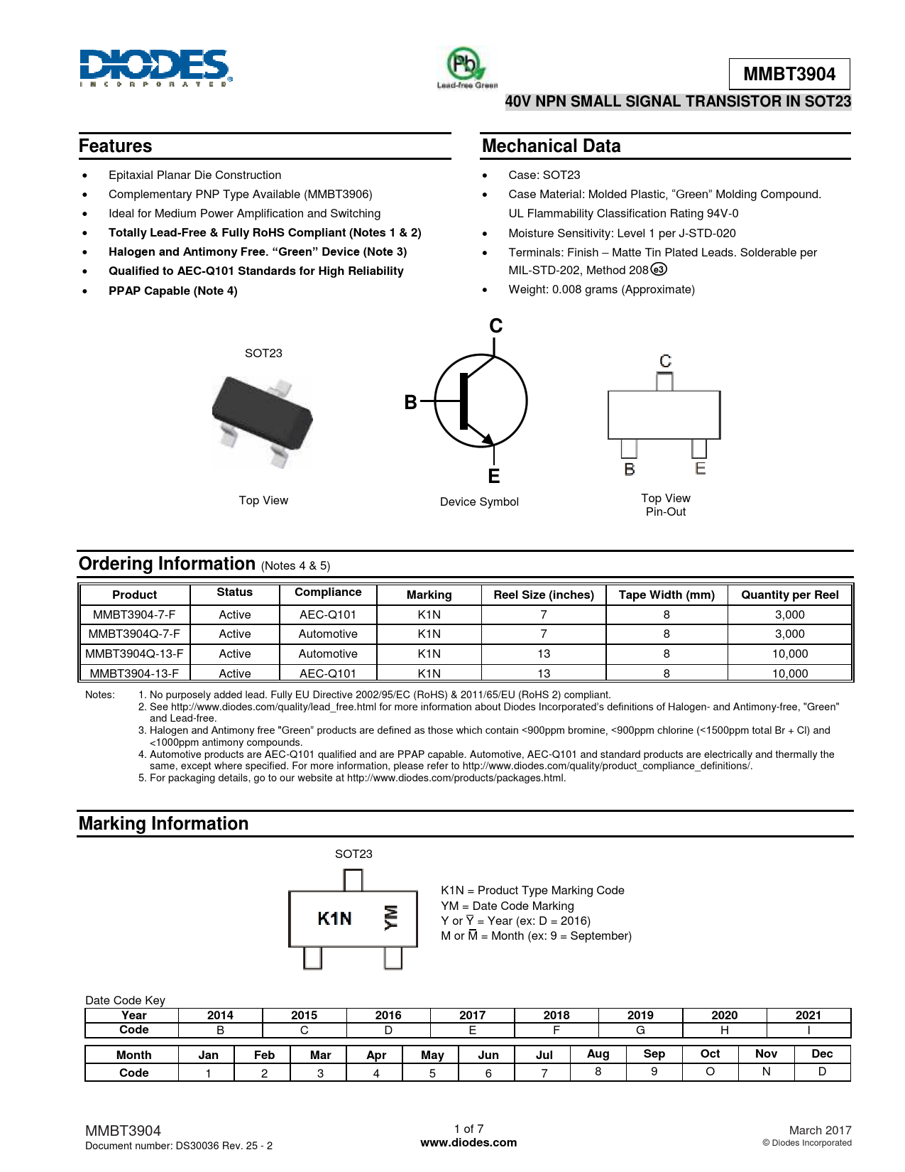 MMBT3904-7-F Active AEC-Q101 K1N 7 8 3,000 MMBT3904Q-7-F Active Automotive K1N 7 8 3,000 MMBT3904Q-13-F Active Automotive K1N 13 8 10,000 MMBT3904-13-F Active AEC-Q101 K1N 13 8 10,000 Notes: 1. No purposely added lead. Fully EU Directive 2002/95/EC (RoHS) & 2011/65/EU (RoHS 2) compliant. 2. See http://www.diodes.com/quality/lead_free.html for more information about Diodes Incorporated’s definitions of Halogen- and Antimony-free, "Green" and Lead-free. 3. Halogen and Antimony free "Green” products are defined as those which contain <900ppm bromine, <900ppm chlorine (<1500ppm total Br + Cl) and <1000ppm antimony compounds. 4. Automotive products are AEC-Q101 qualified and are PPAP capable. Automotive, AEC-Q101 and standard products are electrically and thermally the same, except where specified. For more information, please refer to http://www.diodes.com/quality/product_compliance_definitions/. 5. For packaging details, go to our website at http://www.diodes.com/products/packages.html.