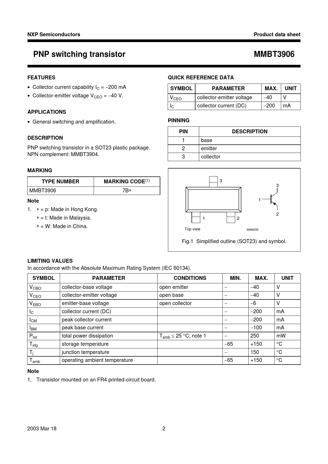 NXP Semiconductors. Product data sheet. PNP switching transistor. MMBT3906. FEATURES. QUICK REFERENCE DATA. SYMBOL. PARAMETER. MAX. UNIT