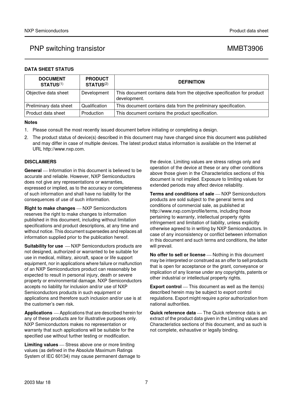 DATA SHEET STATUS. DOCUMENT. PRODUCT. DEFINITION. STATUS. Notes. DISCLAIMERS. General. Terms and conditions of sale