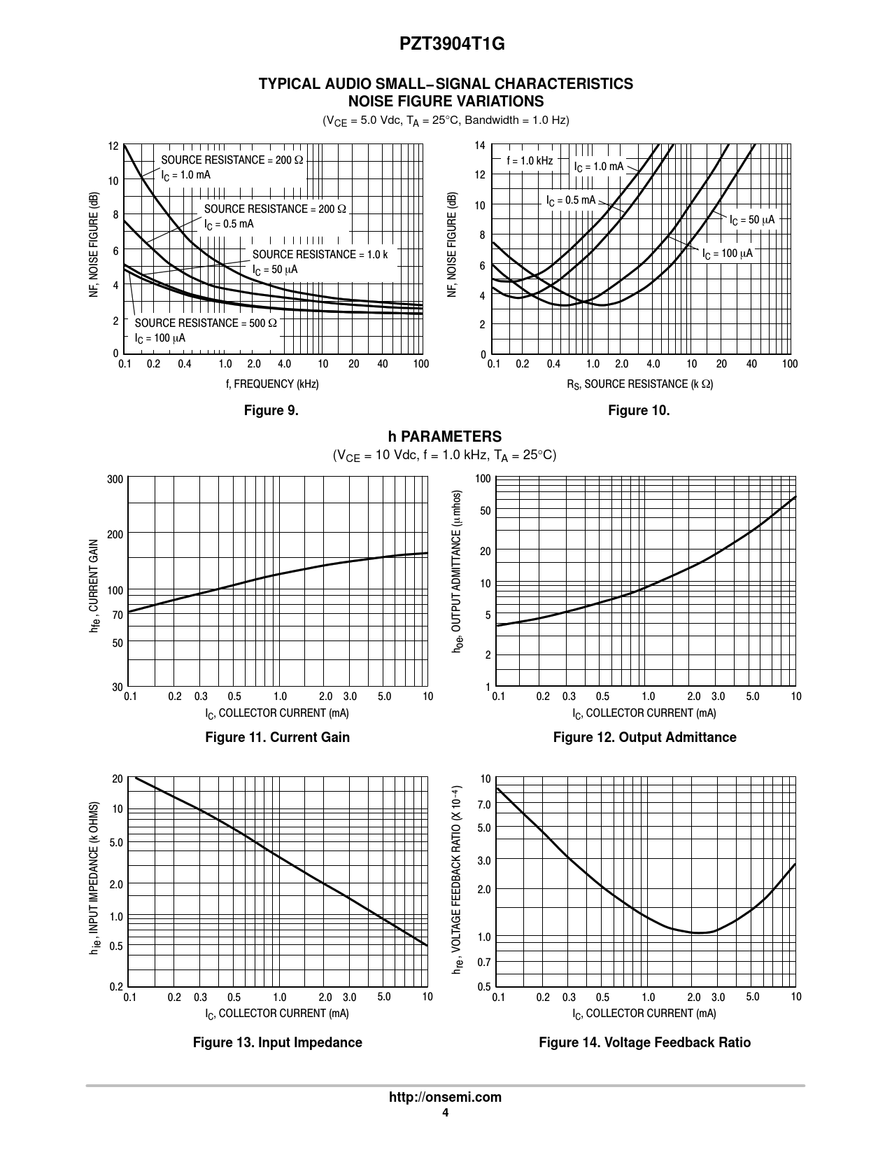 PZT3904T1G. TYPICAL AUDIO SMALL− SIGNAL CHARACTERISTICS. NOISE FIGURE VARIATIONS. Figure 9. Figure 10. h PARAMETERS