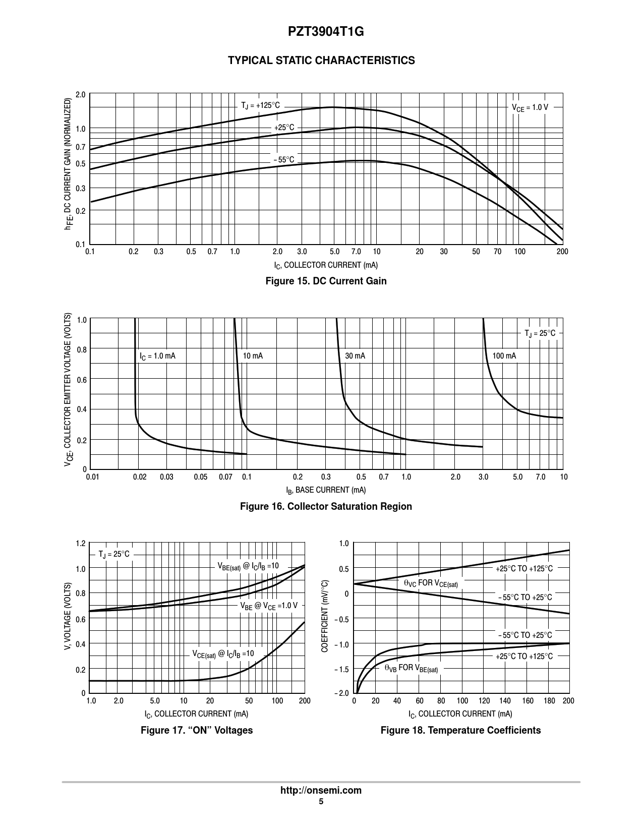 PZT3904T1G. TYPICAL STATIC CHARACTERISTICS. Figure 15. DC Current Gain. Figure 16. Collector Saturation Region