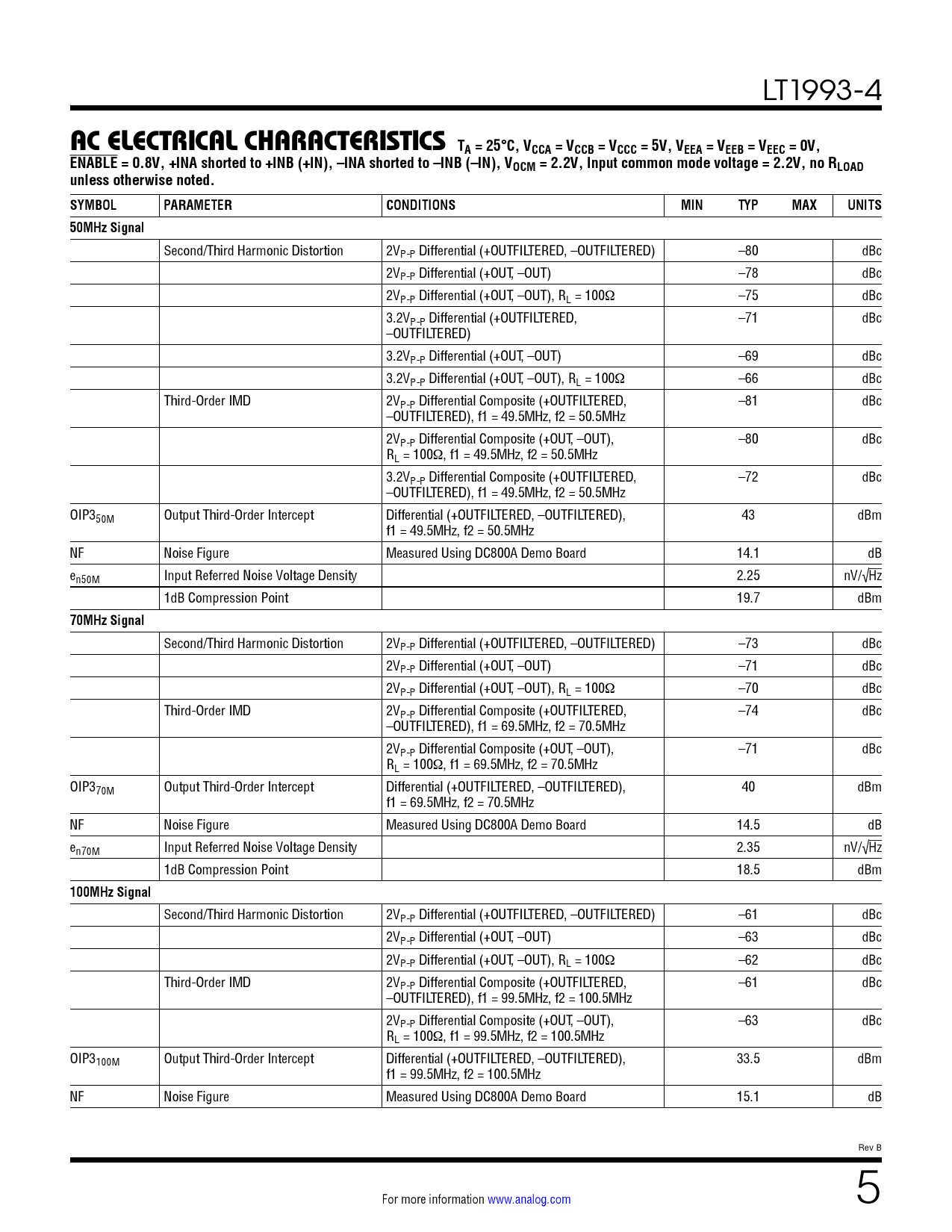 Second/Third Harmonic Distortion 2VP-P Differential (+OUTFILTERED, –OUTFILTERED) –80 dBc 2VP-P Differential (+OUT, –OUT) –78 dBc 2VP-P Differential (+OUT, –OUT), RL = 100 –75 dBc 3.2VP-P Differential (+OUTFILTERED, –71 dBc –OUTFILTERED) 3.2VP-P Differential (+OUT, –OUT) –69 dBc 3.2VP-P Differential (+OUT, –OUT), RL = 100 –66 dBc Third-Order IMD 2VP-P Differential Composite (+OUTFILTERED, –81 dBc –OUTFILTERED), f1 = 49.5MHz, f2 = 50.5MHz 2VP-P Differential Composite (+OUT, –OUT), –80 dBc RL = 100 , f1 = 49.5MHz, f2 = 50.5MHz 3.2VP-P Differential Composite (+OUTFILTERED, –72 dBc –OUTFILTERED), f1 = 49.5MHz, f2 = 50.5MHz OIP350M Output Third-Order Intercept Differential (+OUTFILTERED, –OUTFILTERED), 43 dBm f1 = 49.5MHz, f2 = 50.5MHz NF Noise Figure Measured Using DC800A Demo Board 14.1 dB en50M Input Referred Noise Voltage Density 2.25 nV/√Hz 1dB Compression Point 19.7 dBm