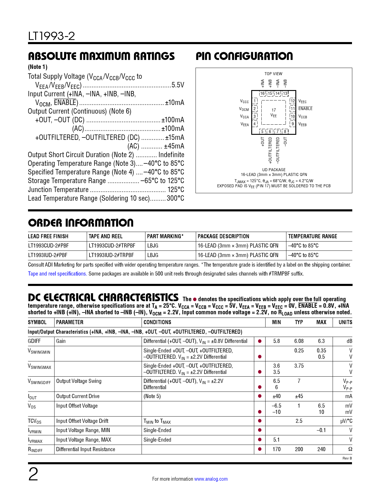 LT1993-2 ABSOLUTE MAXIMUM RATINGS PIN CONFIGURATION (Note 1) Total Supply Voltage (V TOP VIEW CCA/VCCB/VCCC to VEEA/VEEB/VEEC) ..5.5V +INA +INB –INA –INB Input Current (+INA, –INA, +INB, –INB, 16 15 14 13 VOCM, ENABLE) ..±10mA VCCC 1 12 VEEC Output Current (Continuous) (Note 6) VOCM 2 17 11 ENABLE V +OUT, –OUT (DC) ..±100mA VCCA 3 EE 10 VCCB V V (AC) ...±100mA EEA 4 9 EEB 5 6 7 8 +OUTFILTERED, –OUTFILTERED (DC) ... ±15mA (AC) .. ±45mA +OUT –OUT Output Short Circuit Duration (Note 2) .. Indefinite Operating Temperature Range (Note 3) ..–40°C to 85°C +OUTFILTERED –OUTFILTERED Specified Temperature Range (Note 4) ..–40°C to 85°C UD PACKAGE 16-LEAD (3mm × 3mm) PLASTIC QFN Storage Temperature Range .. –65°C to 125°C TJMAX = 125°C, θJA = 68°C/W, θJC = 4.2°C/W Junction Temperature ... 125°C EXPOSED PAD IS VEE (PIN 17) MUST BE SOLDERED TO THE PCB Lead Temperature Range (Soldering 10 sec)...300°C ORDER INFORMATION LEAD FREE FINISHTAPE AND REELPART MARKING*PACKAGE DESCRIPTIONTEMPERATURE RANGE LT1993CUD-2#PBF LT1993CUD-2#TRPBF LBJG 16-LEAD (3mm × 3mm) PLASTIC QFN –40°C to 85°C LT1993IUD-2#PBF LT1993IUD-2#TRPBF LBJG 16-LEAD (3mm × 3mm) PLASTIC QFN –40°C to 85°C Consult ADI Marketing for parts specified with wider operating temperature ranges. *The temperature grade is identified by a label on the shipping container. Tape and reel specifications. Some packages are available in 500 unit reels through designated sales channels with #TRMPBF suffix. DC ELECTRICAL CHARACTERISTICS The l denotes the specifications which apply over the full operatingtemperature range, otherwise specifications are at TA = 25°C. VCCA = VCCB = VCCC = 5V, VEEA = VEEB = VEEC = 0V, ENABLE = 0.8V, +INAshorted to +INB (+IN), –INA shorted to –INB (–IN), VOCM = 2.2V, Input common mode voltage = 2.2V, no RLOAD unless otherwise noted. SYMBOLPARAMETERCONDITIONSMINTYPMAXUNITSInput/Output Characteristics (+INA, +INB, –INA, –INB, +OUT, –OUT, +OUTFILTERED, –OUTFILTERED) GDIFF Gain Differential (+OUT, –OUT), VIN = ±0.8V Differential l 5.8 6.08 6.3 dB VSWINGMIN Single-Ended +OUT, –OUT, +OUTFILTERED, 0.25 0.35 V –OUTFILTERED. VIN = ±2.2V Differential l 0.5 V VSWINGMAX Single-Ended +OUT, –OUT, +OUTFILTERED, 3.6 3.75 V –OUTFILTERED. VIN = ±2.2V Differential l 3.5 V VSWINGDIFF Output Voltage Swing Differential (+OUT, –OUT), VIN = ±2.2V 6.5 7 VP-P Differential l 6 VP-P IOUT Output Current Drive (Note 5) l ±40 ±45 mA VOS Input Offset Voltage –6.5 1 6.5 mV l –10 10 mV TCVOS Input Offset Voltage Drift TMIN to TMAX l 2.5 µV/°C IVRMIN Input Voltage Range, MIN Single-Ended l –0.1 V IVRMAX Input Voltage Range, MAX Single-Ended l 5.1 V RINDIFF Differential Input Resistance l 170 200 240 Rev B 2 For more information www.analog.com