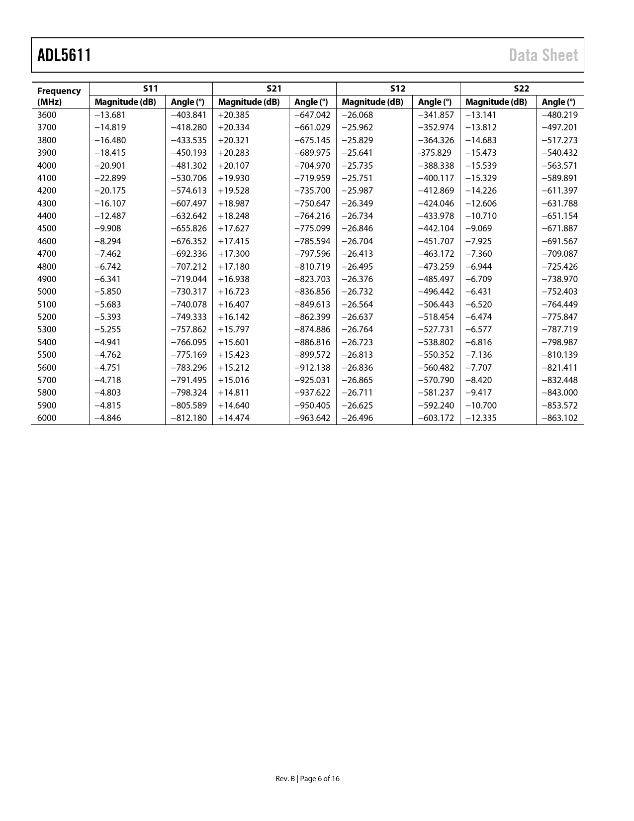 | Páginas / Página | 16 / 6 — ADL5611. Data Sheet. Frequency. S11. S21. S12. S22. (MHz). Magnitude … |