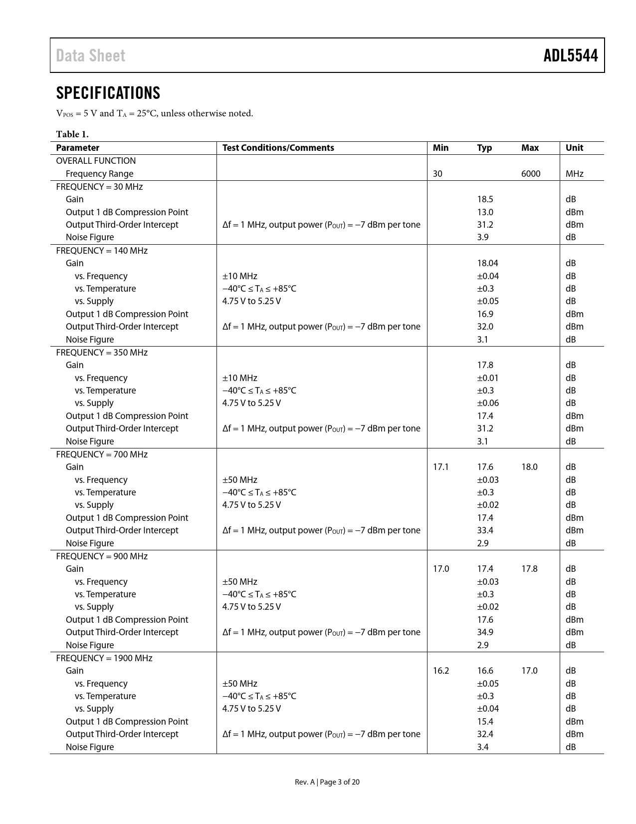 Data Sheet. ADL5544. SPECIFICATIONS. Table 1. Parameter. Test Conditions/Comments. Min. Typ. Max. Unit