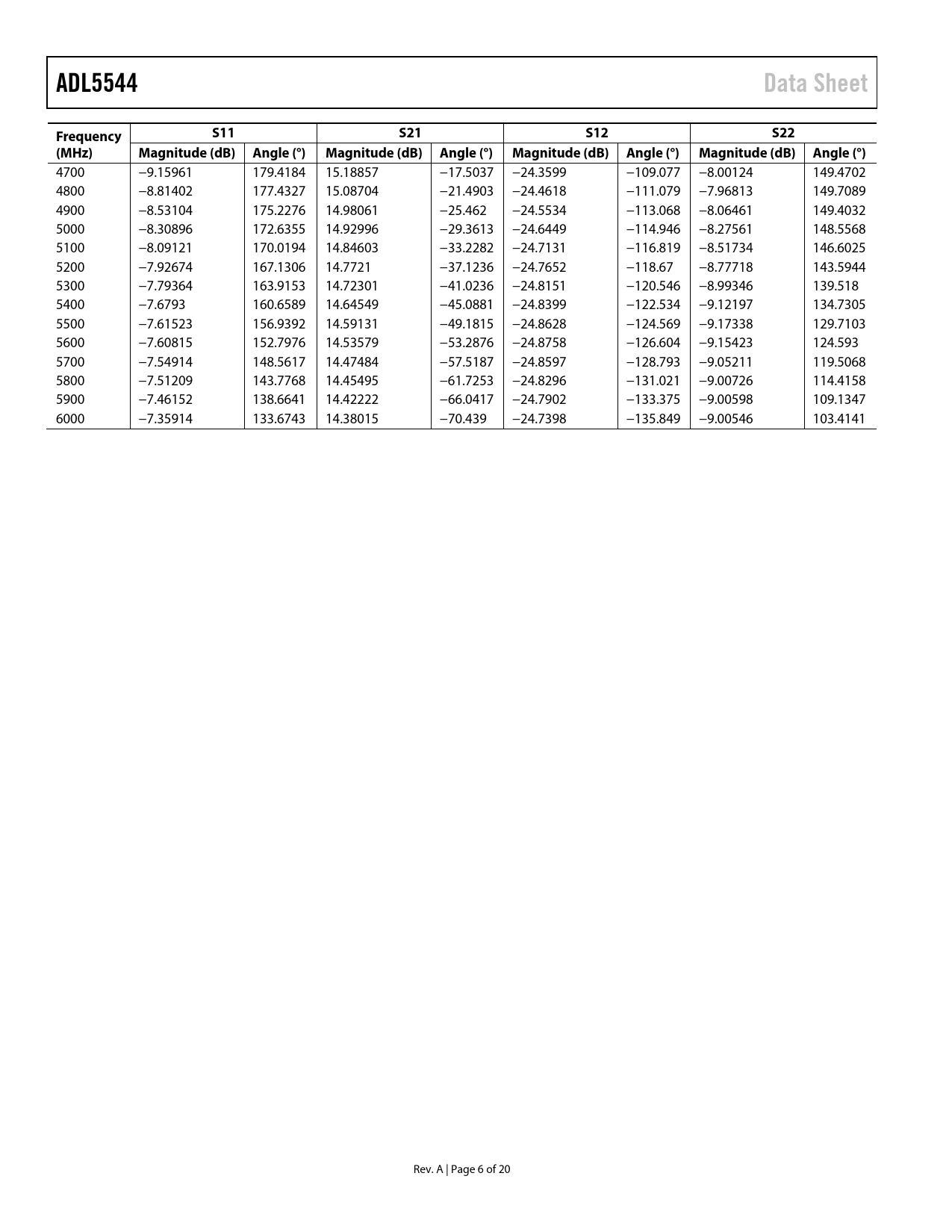 ADL5544 Data Sheet Frequency S11 S21 S12 S22 (MHz) Magnitude (dB) Angle (°) Magnitude (dB) Angle (°) Magnitude (dB) Angle (°) Magnitude (dB) Angle (°)
