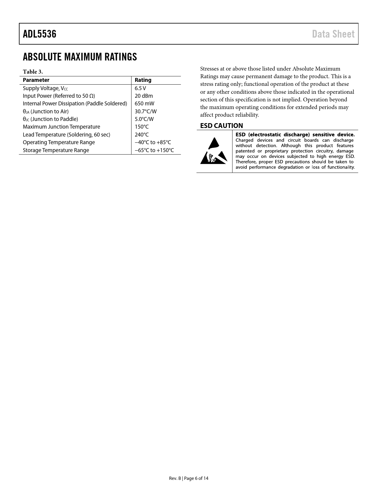 ADL5536. Data Sheet. ABSOLUTE MAXIMUM RATINGS Table 3. Parameter. Rating. ESD CAUTION