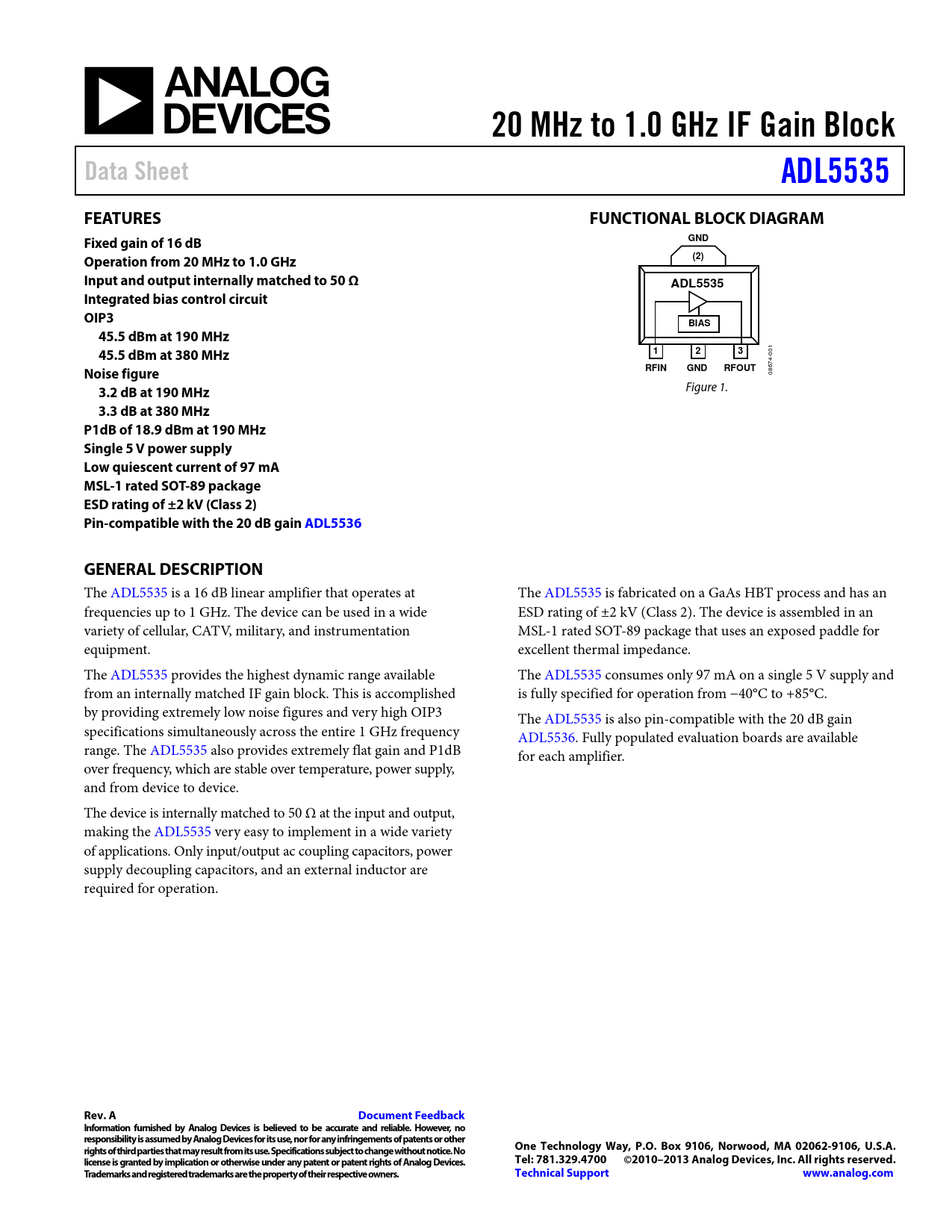 20 MHz to 1.0 GHz IF Gain Block. Data Sheet. ADL5535. FEATURES. FUNCTIONAL BLOCK DIAGRAM. Fixed gain of 16 dB. GND