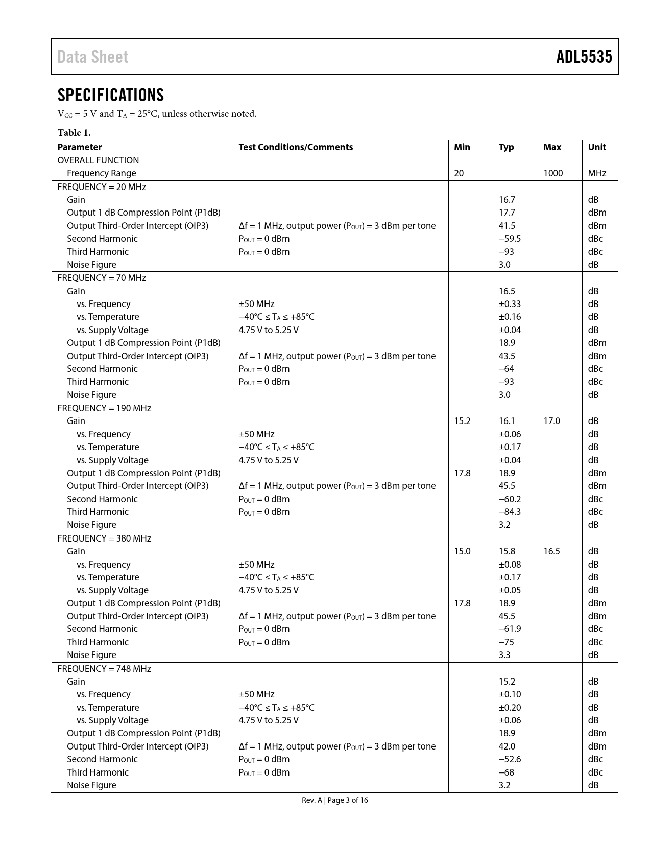 Páginas / Página16 / 3 — Data Sheet. ADL5535. SPECIFICATIONS. Table 1. Parameter. Test …