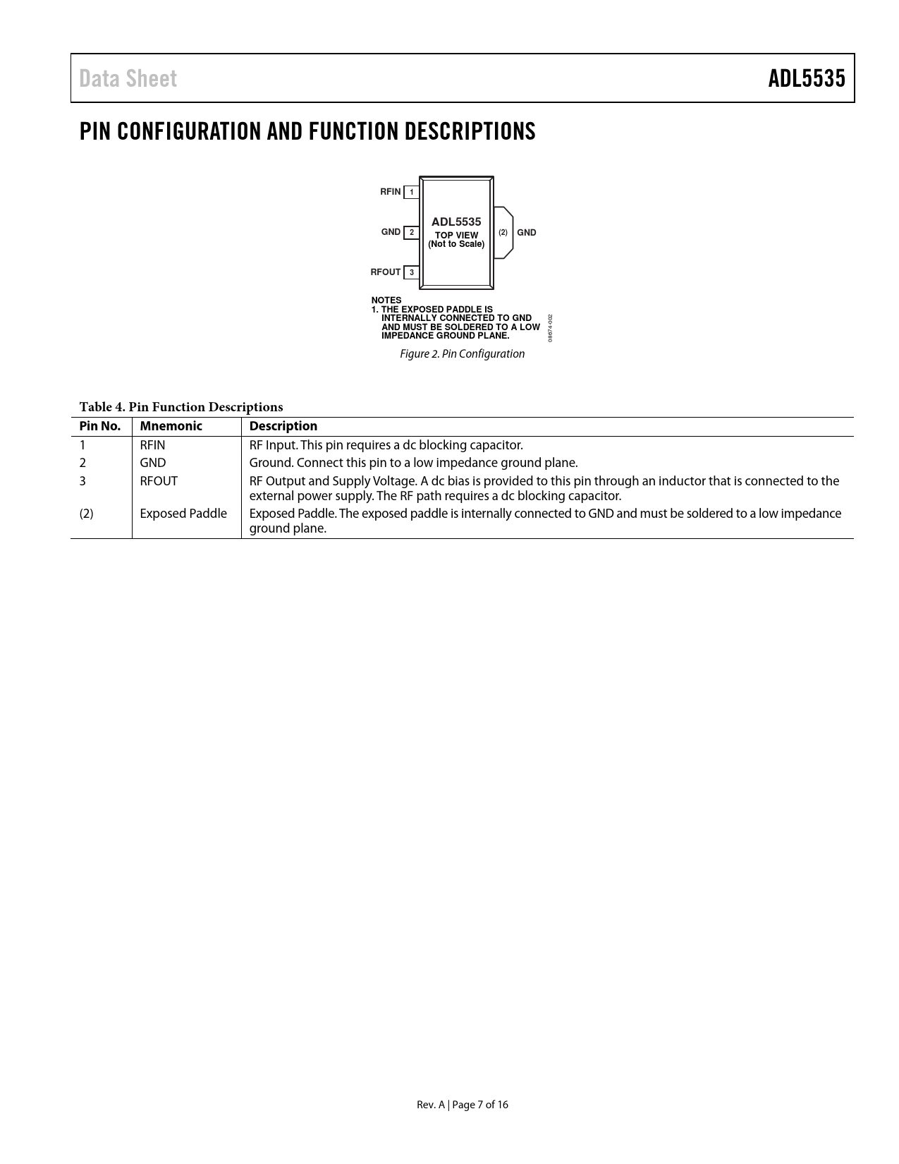 Data SheetADL5535PIN CONFIGURATION AND FUNCTION DESCRIPTIONSRFIN1ADL5535GND2(2)GNDTOP VIEW(Not to Scale)RFOUT3NOTES 1. THE EXPOSED PADDLE IS INTERNALLY CONNECTED TO GND 002 AND MUST BE SOLDERED TO A LOW IMPEDANCE GROUND PLANE. 08674- Figure 2. Pin Configuration Table 4. Pin Function Descriptions Pin No.MnemonicDescription 1 RFIN RF Input. This pin requires a dc blocking capacitor. 2 GND Ground. Connect this pin to a low impedance ground plane. 3 RFOUT RF Output and Supply Voltage. A dc bias is provided to this pin through an inductor that is connected to the external power supply. The RF path requires a dc blocking capacitor. (2) Exposed Paddle Exposed Paddle. The exposed paddle is internally connected to GND and must be soldered to a low impedance ground plane. Rev. A | Page 7 of 16 Document Outline Features Functional Block Diagram General Description Table of Contents Revision History Specifications Typical Scattering Parameters (S-Parameters) Absolute Maximum Ratings ESD Caution Pin Configuration and Function Descriptions Typical Performance Characteristics Basic Connections Soldering Information and Recommended PCB Land Pattern ACPR Performance Error Vector Magnitude (EVM) Performance ADC Driving Application Evaluation Board Outline Dimensions Ordering Guide